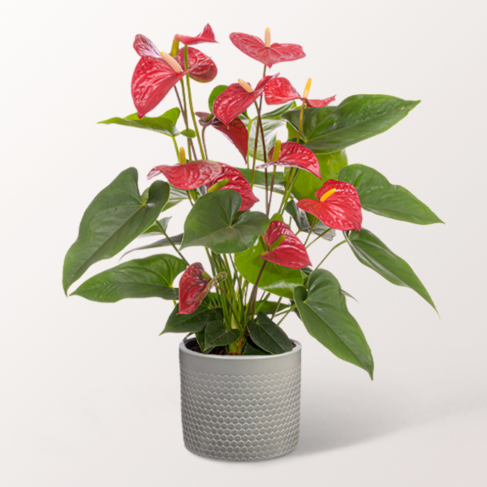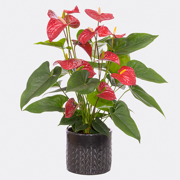 Exotische Anthurie in Rot in einem modernen Keramiktopf (ca. 14 cm). Pflanzengröße: ca. 30-40 cm.Hinweis: Die Pflanze ist leicht giftig. Hersteller:FloraPrima GmbHDidderser Str. 2838176 Wendeburginfo@floraprima.de