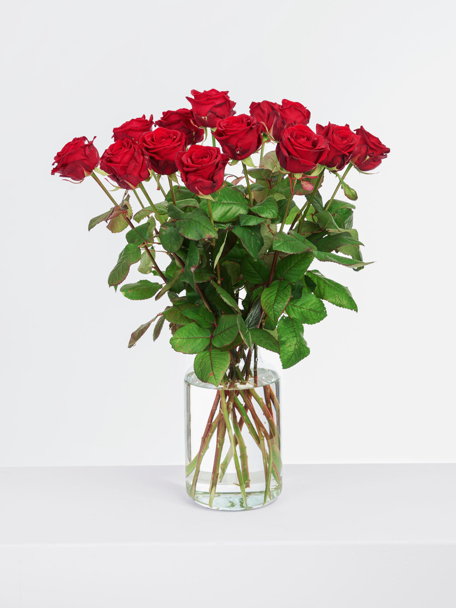 15 wunderschöne rote Rosen, die nicht nur durch ihren starken Duft überzeugen, sondern auch optisch ein echtes Highlight sind. Stilecht verpackt und geliefert im Fleurop-Karton. Versand ohne Vase.