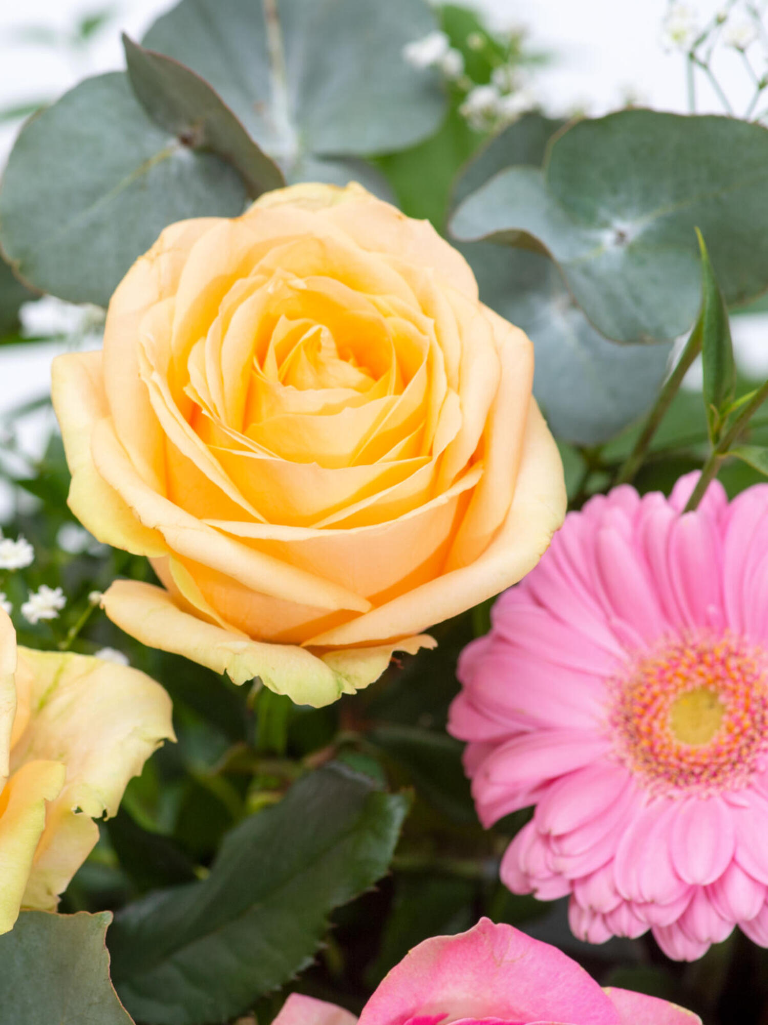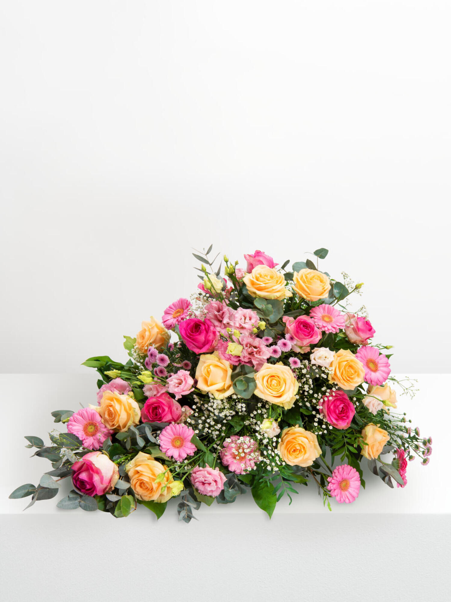 Trauergesteck in Rosa-Apricot mit leichten Weißakzenten mit Rosen, Germini, Santini, Eustoma und Schleierkraut. Als Beiwerk werden Pistazie, Aralie, Eukalyptus und Efeu verwendet.