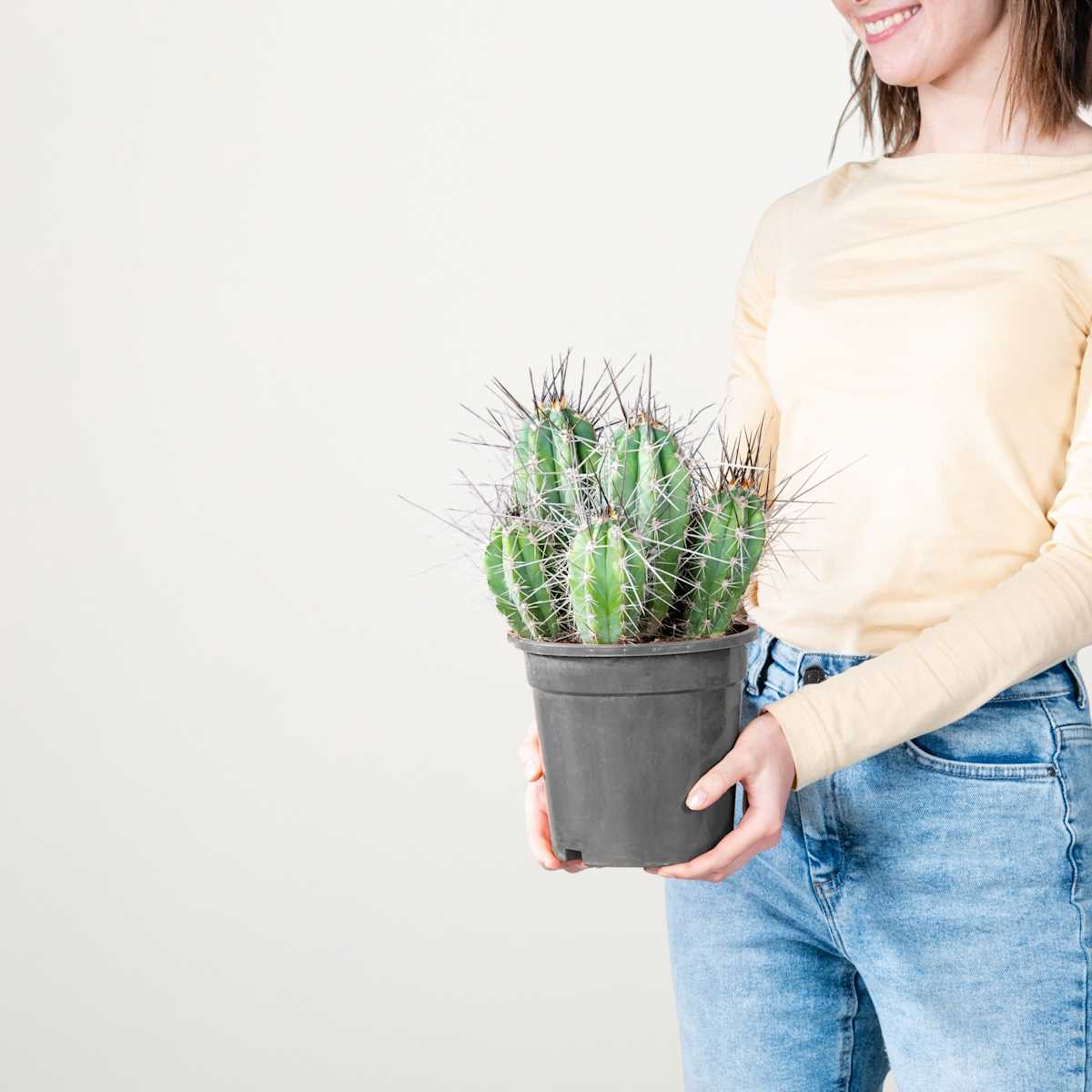 Der Säulenkaktus ‚Coryne‘ ist geradezu ein Top-Model unter den Kakteen. Dunkelgrüne Rinde, schlanke, aufrechte Form und auf den breiten Rippen lange, helle Dornen. Botanisch hast du es mit Stetsonia coryne zu tun. Top-Model-Allüren hast du mit ihm übrigens nicht zu befürchten. Ganz im Gegenteil, er nur wenig Zuwendung. Du hast vergessen ihn zu gießen? Kein Thema, er ist auf Wassersparen programmiert und übersteht Trockenperioden mit Links. Am besten stellst du ihn an einen hellen Standort ohne zu viel direkte Sonne, dann fühlt er sich wohl.
