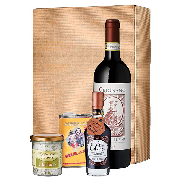 Das kulinarische Herz Italiens in einer Meisterschaft die rundum begeistert: Seidiger Chianti Oregano-Olivenöl fassgereifter Balsamico CremoneserKräutersalz. Im naturfarbenen Präsentkarton.Das umwerfendes Set besteht aus:1 x Kräutersalz Cremoneser1 x Olivenöl Maimona (025 l)1 x Chianti Rufina DOCG Grignano1 x Aceto Balsamico di Modena Bronze Villa Estense und1 x 3er Präsentkarton dunkelblau vorhandener Alkoholgehalt: Chianti Rufina DOCG Grignano 14 % Weingut/Abfüller: Grignano 50065 Pontassieve (FI) Italien Hinweis: trocken Wein enthält Sulfite. Aus Gründen des Jugendschutzes verkaufen und geben wir Alkohol ausschließlich an Personen über 18 Jahren ab.