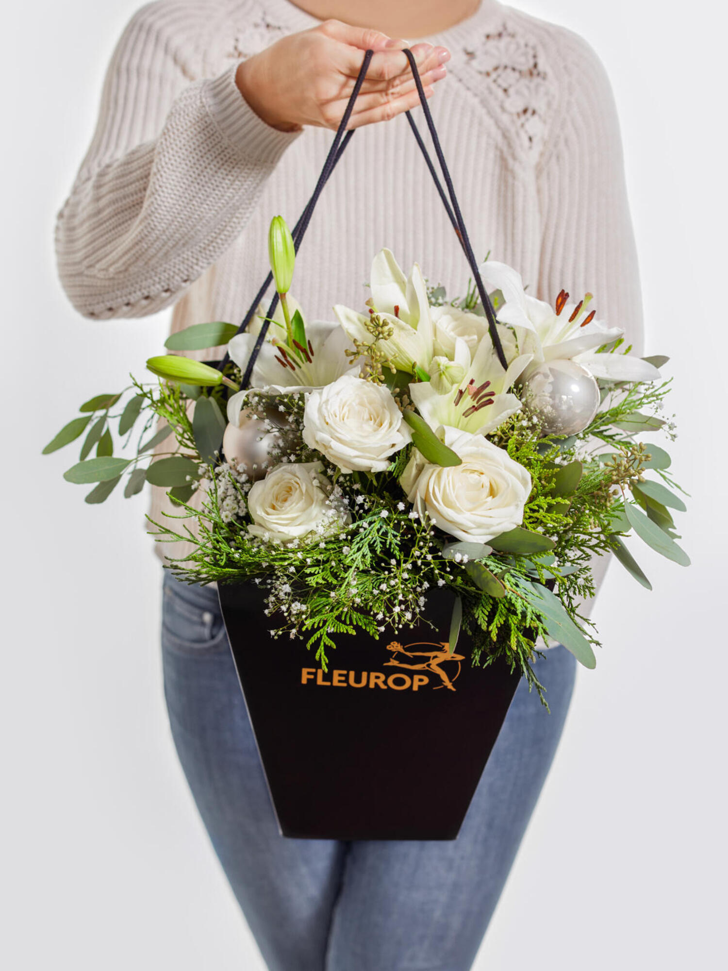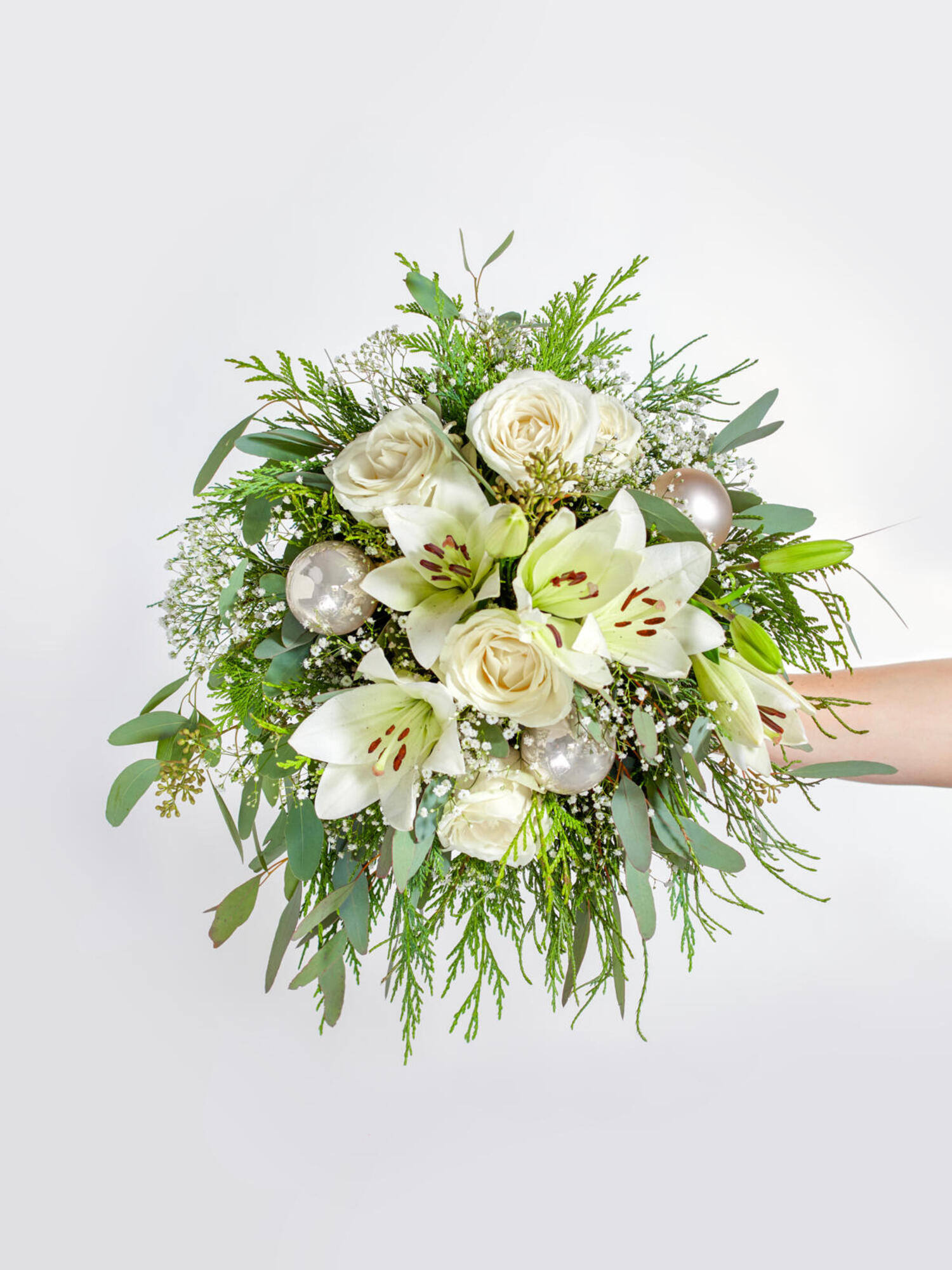 Rund gebundener Strauß in Weiß mit Lilien, Rosen und Schleierkraut sowie cremefarbenen Weihnachtskugeln aus Glas als Accessoires. Als Beiwerk werden Eukalyptus und Konifere verwendet.