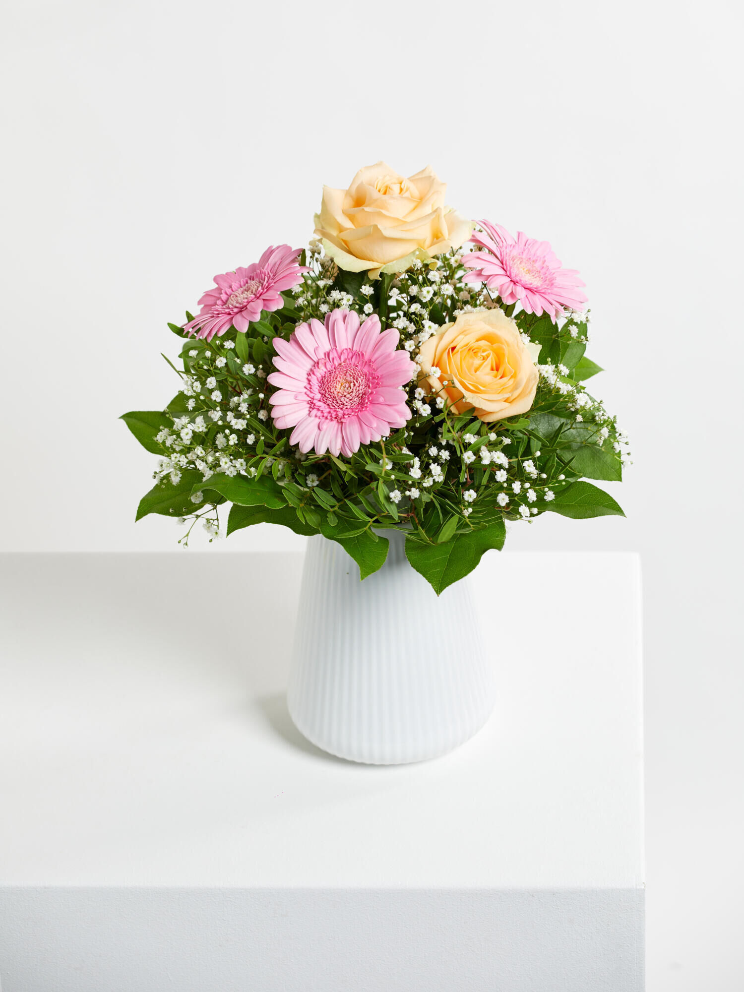 Bestellen Sie die schönste Art von Grüßen! Rund gebundener Strauß in Rosa-Apricot mit Rosen, Germini und Schleierkraut. Als Beiwerk werden Pistazie und Salal verwendet.
