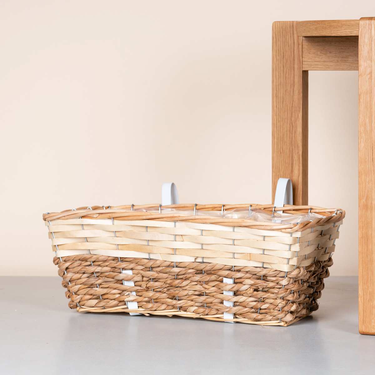 Du möchtest deinen Balkon mit einer farbenfrohen Bepflanzung schmücken? Dann haben wir den perfekten Balkonkasten für dich. Unser „Seegras Pflanzenkasten in Natur“ hat eine Außenlänge von 40 cm, eine Breite von 20 cm und eine Höhe von 15 cm. Gefertigt ist er aus Holz mit einem dekorativen Flechtwerk aus natürlichem Seegras. Innen ist der hübsche Pflanzenkasten mit klarsichtiger Recyclingfolie ausgestattet. Damit du den Kasten problemlos an deinem Balkongeländer befestigen kannst, ist dieser mit zwei weißen Metallbügeln ausgestattet. Die Aufhängevorrichtung hat eine Breite von jeweils 1,5 cm. Hier kommen nicht nur leuchtend bunte Blumen toll zur Geltung, auch filigrane Gräser wirken im dekorativen Flechtkorb besonders ansprechend.