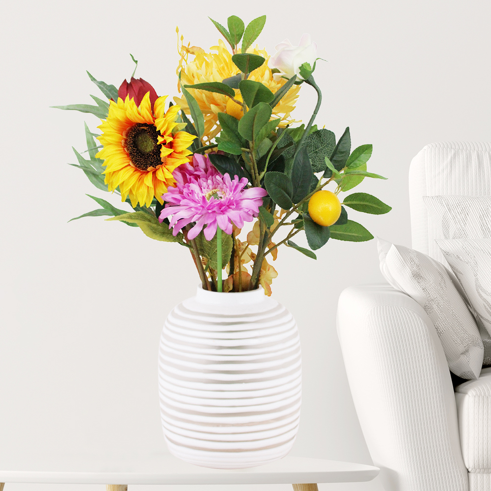 Blumenstrauß aus hochwertigen Seidenblumen Der wunderschöne Seidenblumenstrauß Amina ist sommerlich und strahlt pure Freude aus. Die Seidenblumen sehen täuschend echt aus und bringen Farbe in jeden Raum, in das Büro oder in den Empfangsbereich. In einer hohen gefärbten Vase kommen die hochwertigen Seidenblumen besonders schön zur Geltung. Der Blumenstrauß besteht unter anderem aus Nachbildungen von Sonnenblumen, Gerbera, Dahlien und Rosen. Der Seidenblumenstrauß Amina wird mit einer Broschüre geliefert. In dieser sind die enthaltenen Blumensorten benannt und sie enthält eine Anleitung, wie die Seidenblumen am besten in einer Vase arrangiert werden können. Seidenblumen sind das perfekte Geschenk für viele Anlässe und bringen dem Empfänger langanhaltende Freude. Einfach die wunderschönen Blumen in einer hohen Vase entsprechend des eigenen Geschmacks arrangieren und sich über diesen wunderschönen Blumenstrauß freuen! Das Angebot ist nicht mit anderen Aktionen oder Gutscheinen kombinierbar.