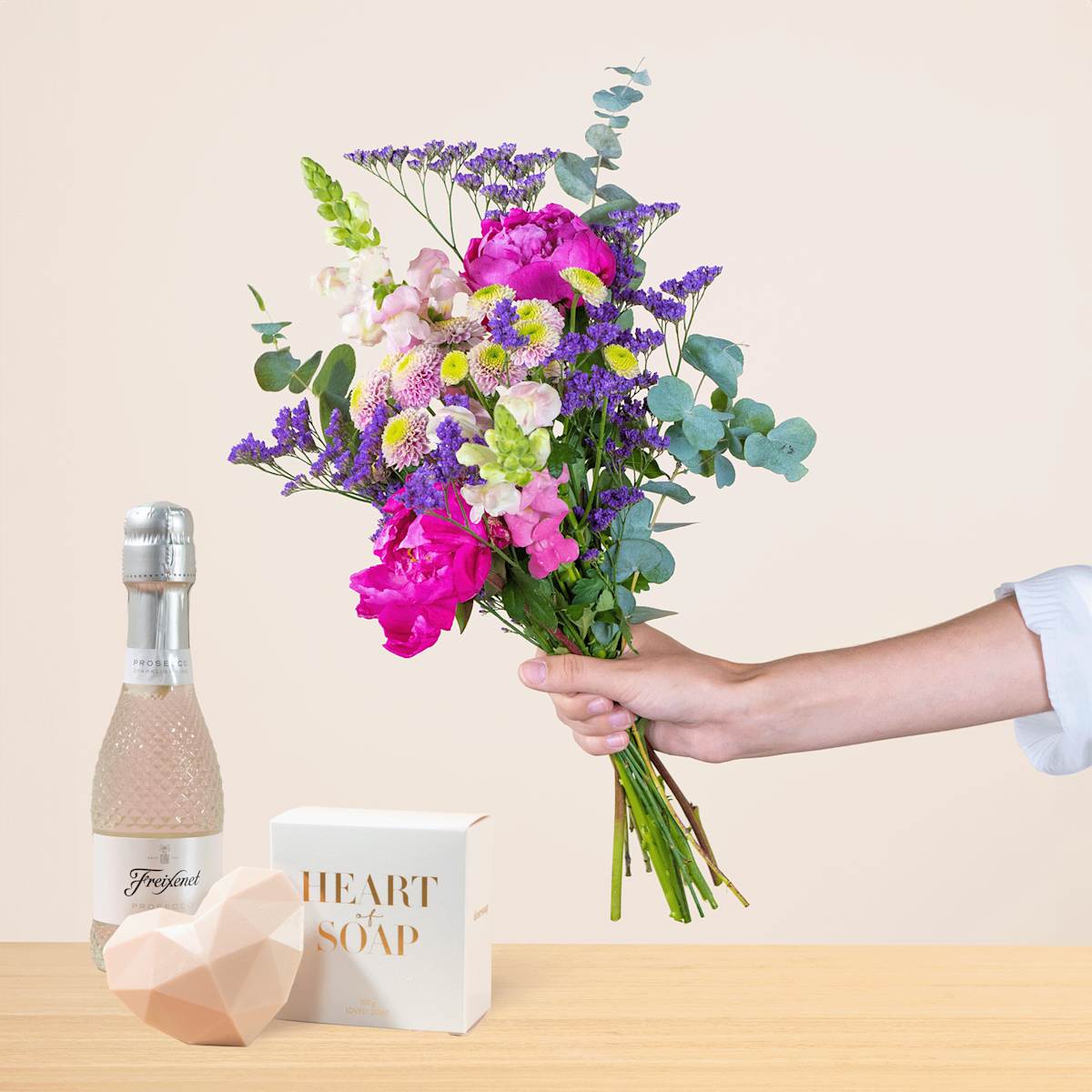 Du suchst nach einem passenden Präsent für deinen Lieblingsmenschen? Dann hat deine Suche jetzt ein Ende. Mit unserem hübschen Wiesenstrauß Sommerbote mit unserem Geschenkset Schaumparty triffst du den Nagel auf den Kopf! Die herrliche Blütenpracht präsentiert sich in kräftigem Pink, Lila und leuchtendem Gelb. Besonders herausragend sind die üppigen Blütenköpfe der Pfingstrosen, die von Löwenmaul, Chrysanthemen, Limonium und Eukalyptus begleitet werden. Ist dieser Anblick nicht bezaubernd? Mit einem Durchmesser von ca. 23 cm und einer Stiellänge von etwa 35 cm ist der Wiesenstrauß ein großartiges Geschenk, das garantiert Freude bereitet. Also warte nicht zu lange! Du bestellst und wir bringen das Präsent ganz schnell an seinen Bestimmungsort.