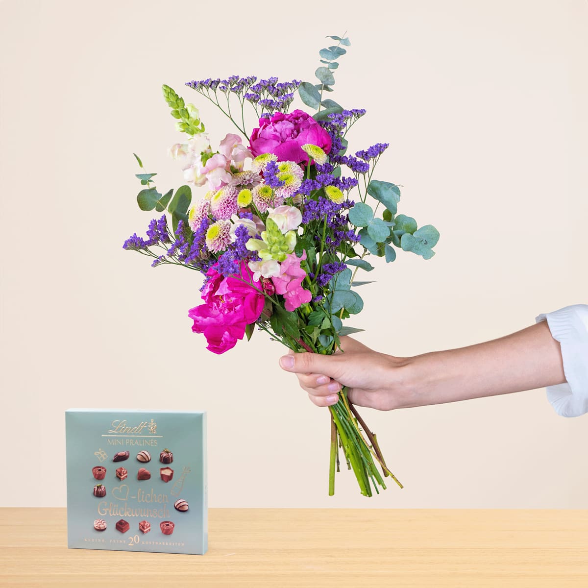 Du suchst nach einem passenden Präsent für deinen Lieblingsmenschen? Dann hat deine Suche jetzt ein Ende. Mit unserem hübschen Wiesenstrauß Sommerbote mit den Lindt Pralinés Glückwunsch triffst du den Nagel auf den Kopf! Die herrliche Blütenpracht präsentiert sich in kräftigem Pink, Lila und leuchtendem Gelb. Besonders herausragend sind die üppigen Blütenköpfe der Pfingstrosen, die von Löwenmaul, Chrysanthemen, Limonium und Eukalyptus begleitet werden. Ist dieser Anblick nicht bezaubernd? Mit einem Durchmesser von ca. 23 cm und einer Stiellänge von etwa 35 cm ist der Wiesenstrauß ein großartiges Geschenk, das garantiert Freude bereitet. Also warte nicht zu lange! Du bestellst und wir bringen das Präsent ganz schnell an seinen Bestimmungsort.