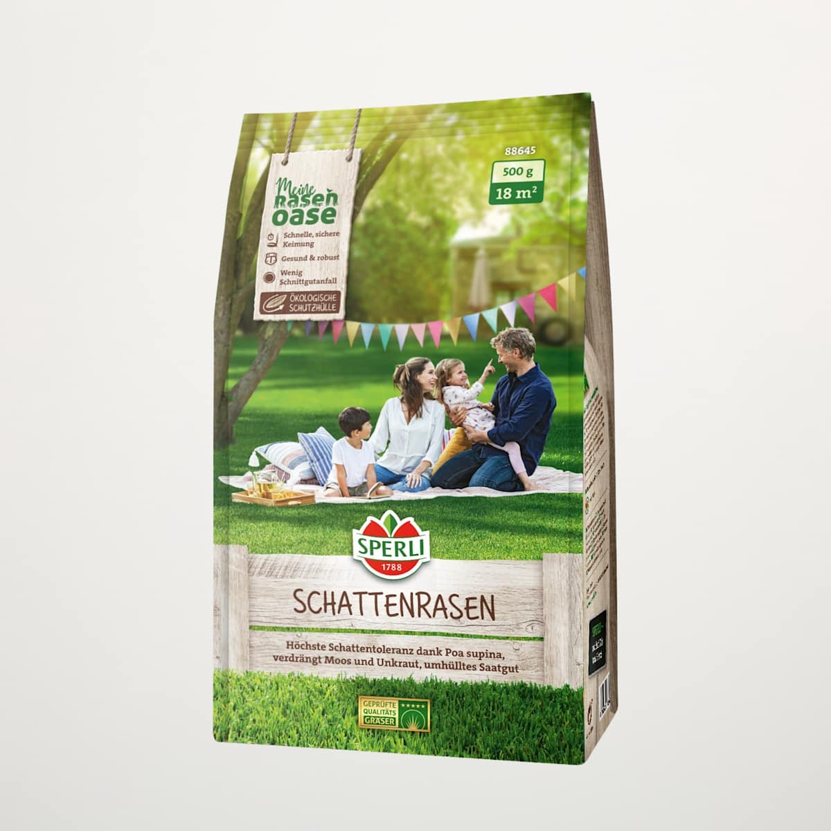 Schattige Flächen unter Bäumen sind im Garten besonders im Sommer eine einzigartige Oase, an der du gerne deinen Liegestuhl aufstellst oder dich mit deinen Liebsten auf einer Picknickdecke zusammensetzt. Fehlt nur noch der perfekte Rasen? Kein Problem! SPERLI’s Schattenrasen (umhüllt) sorgt auch auf Flächen, die nur wenig Sonne abbekommen, für einen grünen Teppich. Aussäen kannst du ihn von März bis September, dafür einfach den Boden etwas auflockern und glätten, die Schattenrasen Samen breitwürfig verteilen, leicht einarbeiten, angießen, fertig! Schon nach ein bis zwei Wochen kannst du dann die ersten grünen Halme sehen. Übrigens sind die Samen umhüllt, dadurch lassen sie sich zum einen einfacher ausbringen, zum andern sorgt diese Schutzhülle für eine bessere und schnellere Keimung.