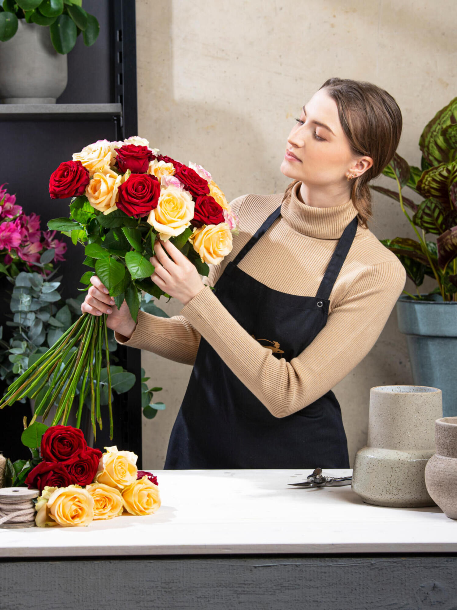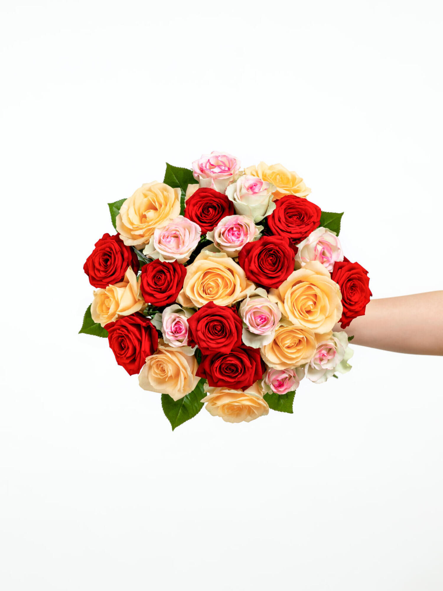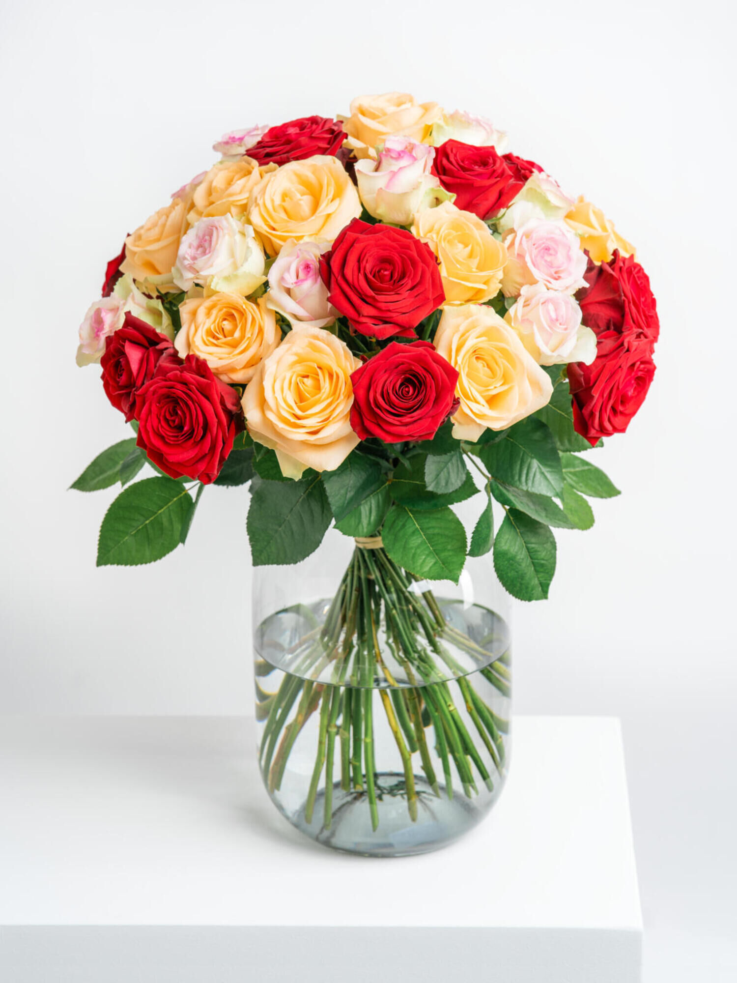 Unser Rosenstrauß „Sprachlos vor Glück“ lässt Herzen höher schlagen. ➤ Rund gebundener Strauß mit großköpfigen, verschiedenfarbigen Rosen kaufen