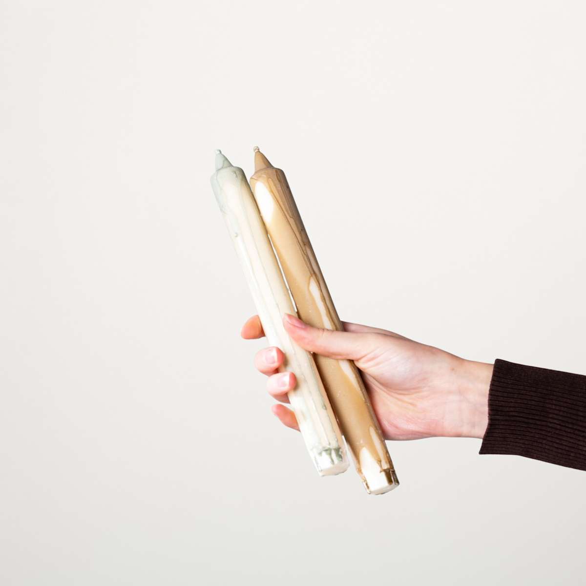 Set bestehend aus 2 Kerzen. Farben: Grün & Braun mit Farbverlauf. Maße: Höhe: 25 cm. Durchmesser: 2,2 cm