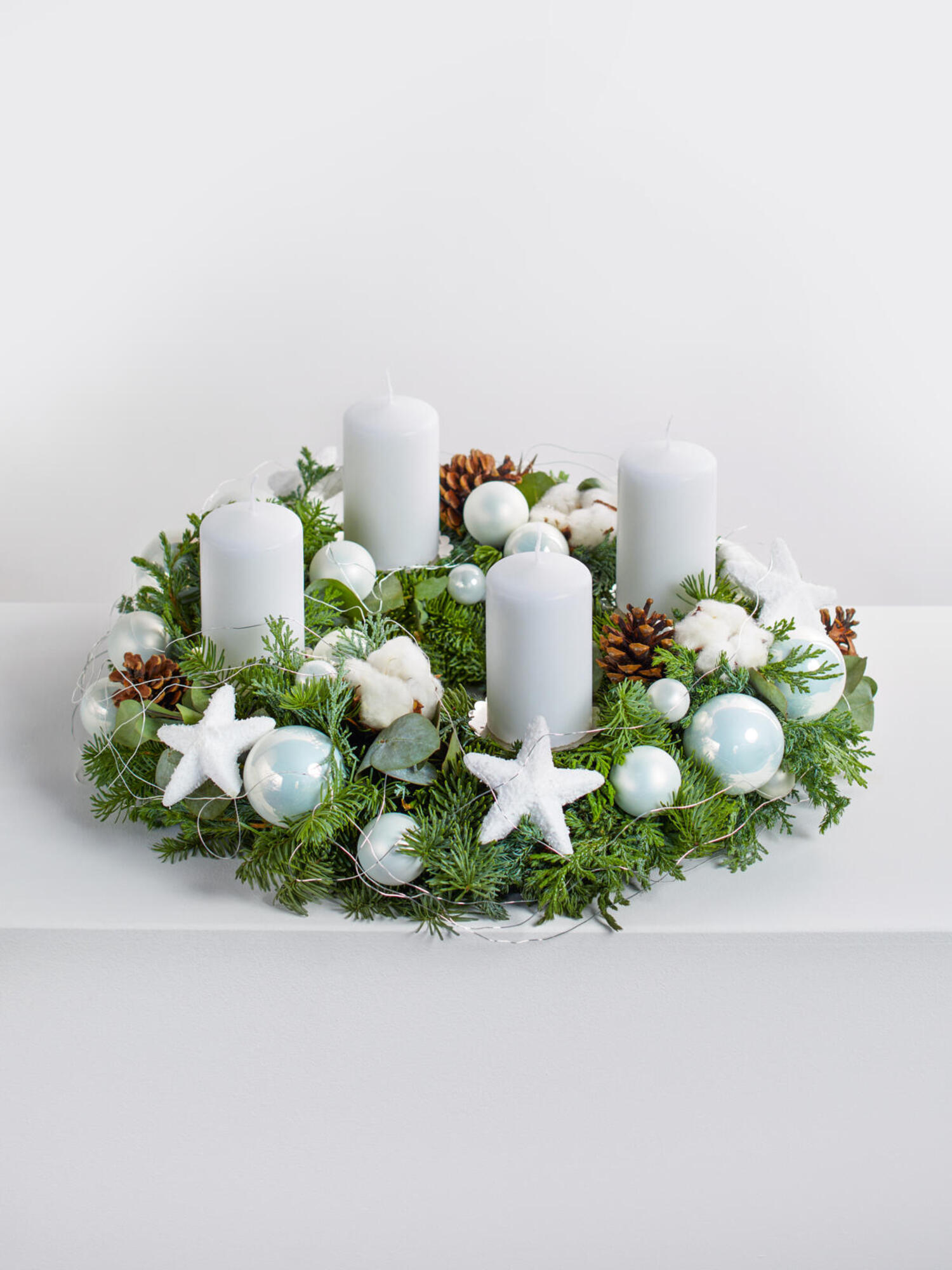 Runder Adventskranz aus Konifere mit vier weißen Stumpenkerzen, Baumwollblüten, Zapfen, weißen Weihnachtskugeln aus Glas, Silberdraht und Dekosternen sowie Eukalyptus. Außendurchmesser ca. 35 cm.