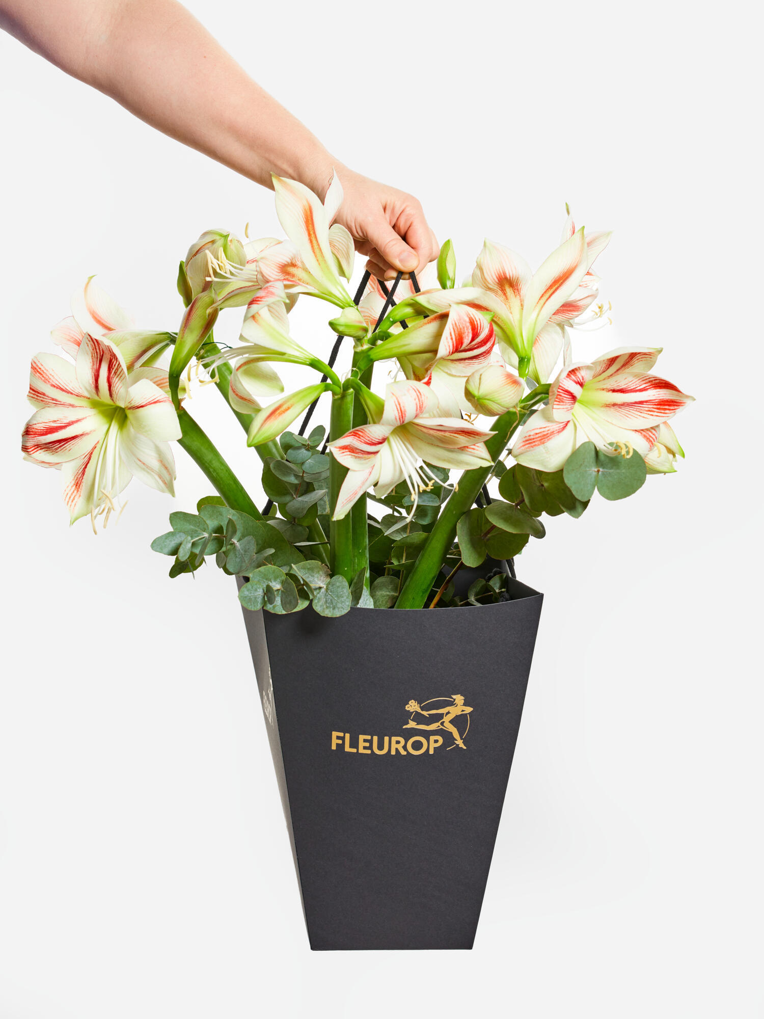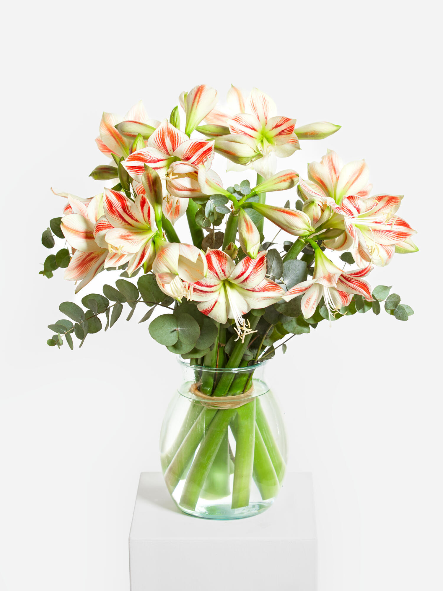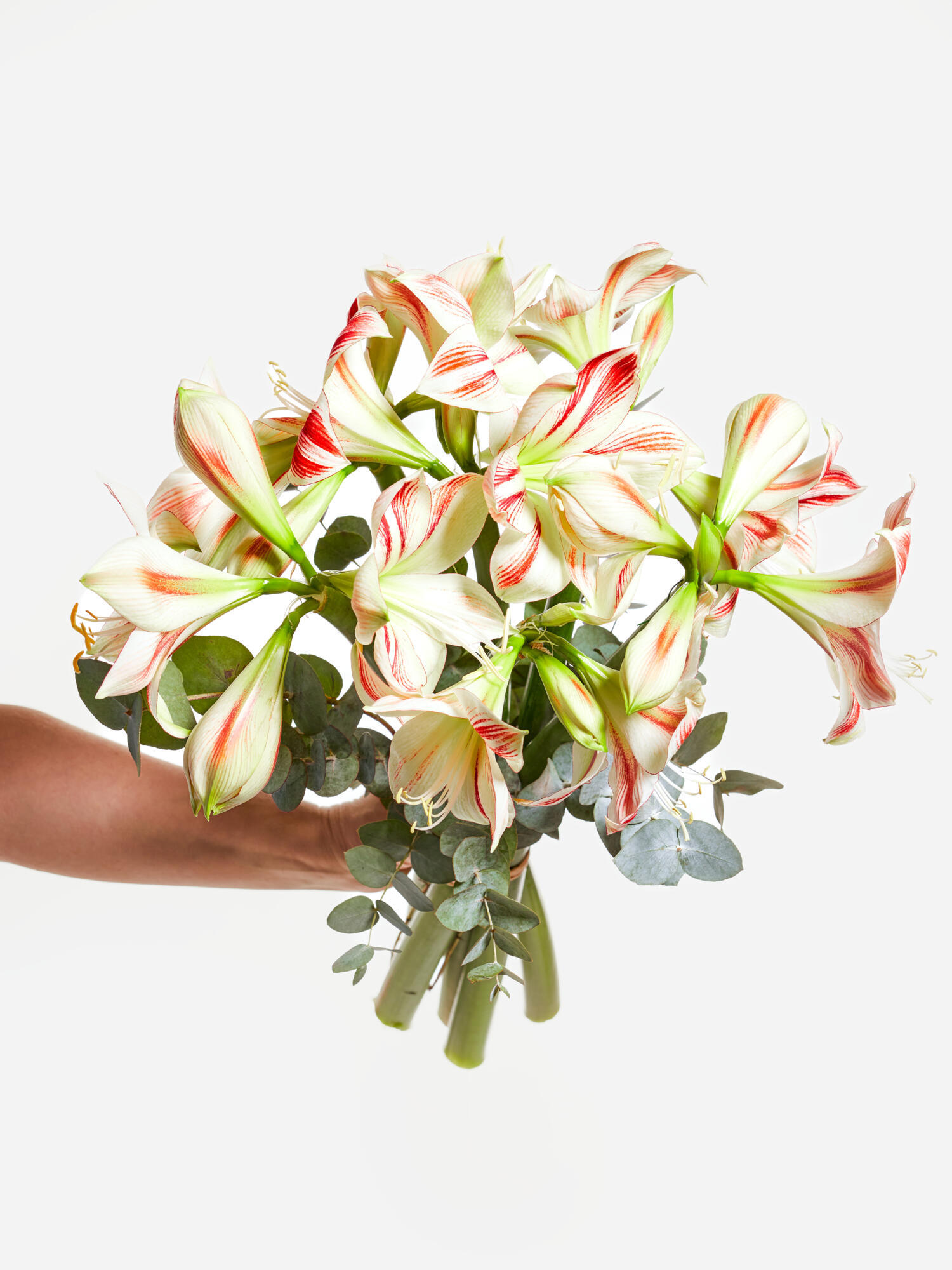 Lang gebundener Amaryllisstrauß in Rot-Weiß und Eukalyptus als Beiwerk. Bei geschlossenen Amaryllis kann das vollständige Aufblühen bis zu 2-4 Tagen dauern.