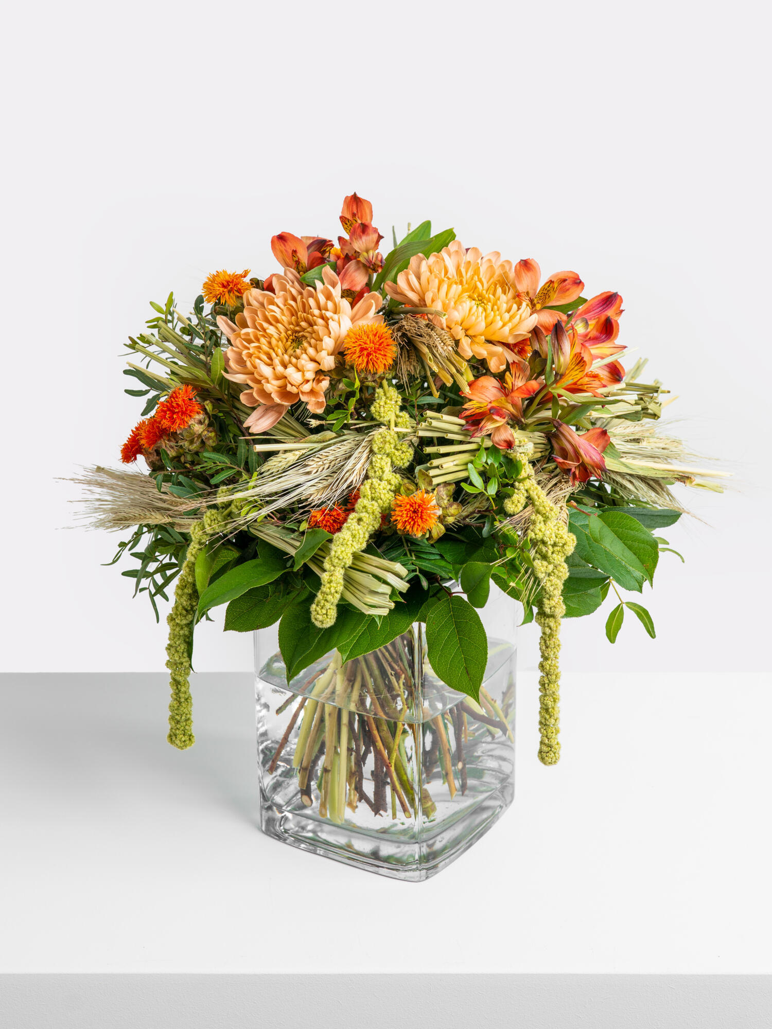 Rund gebundener Herbststrauß in Orange-Grün mit Chrysanthemen, Amaranthus, Carthamus und Inkalilien (Alstroemeria). Als Beiwerk wird Getreide, Salal und Pistazie verwendet.