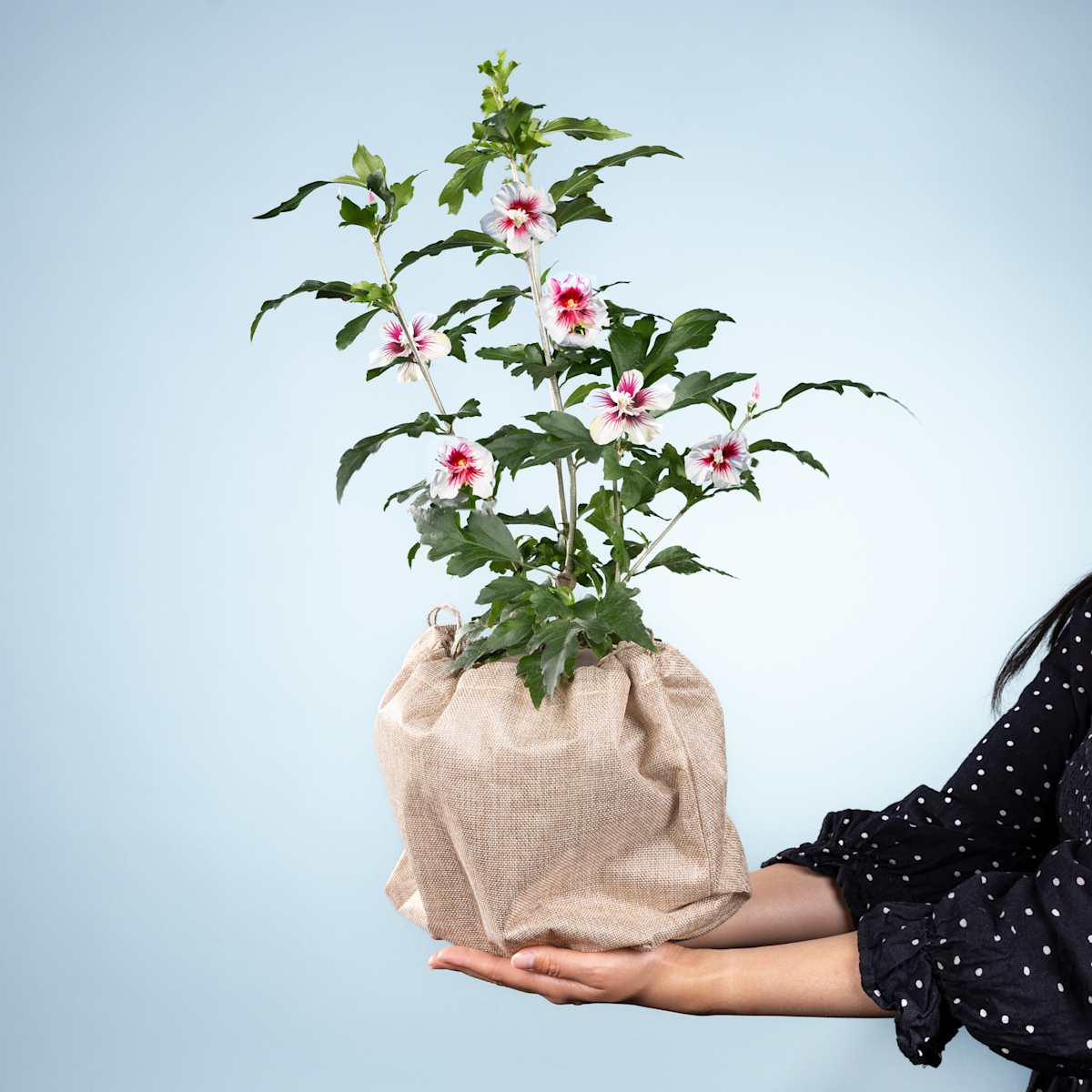 Entdecke unseren zauberhaften Hibiskus Summer Blossom. Dieser prächtige Hibiskus im charmanten Jutebeutel bringt Sommerstimmung in jedes Zuhause. Wusstest du, dass der Hibiskus für seine atemberaubenden Blüten bekannt ist, die je nach Sorte in vielen leuchtenden Farben erstrahlen? Schenke deinen Liebsten ein Stück tropisches Paradies und erfreue sie mit dieser farbenfrohen Schönheit. Ideal für Fensterbank oder Balkon – die Summer Blossom zaubert ein Lächeln auf jedes Gesicht und sorgt für herrliche Blütenpracht. Gönn dir und anderen dieses blühende Glück!