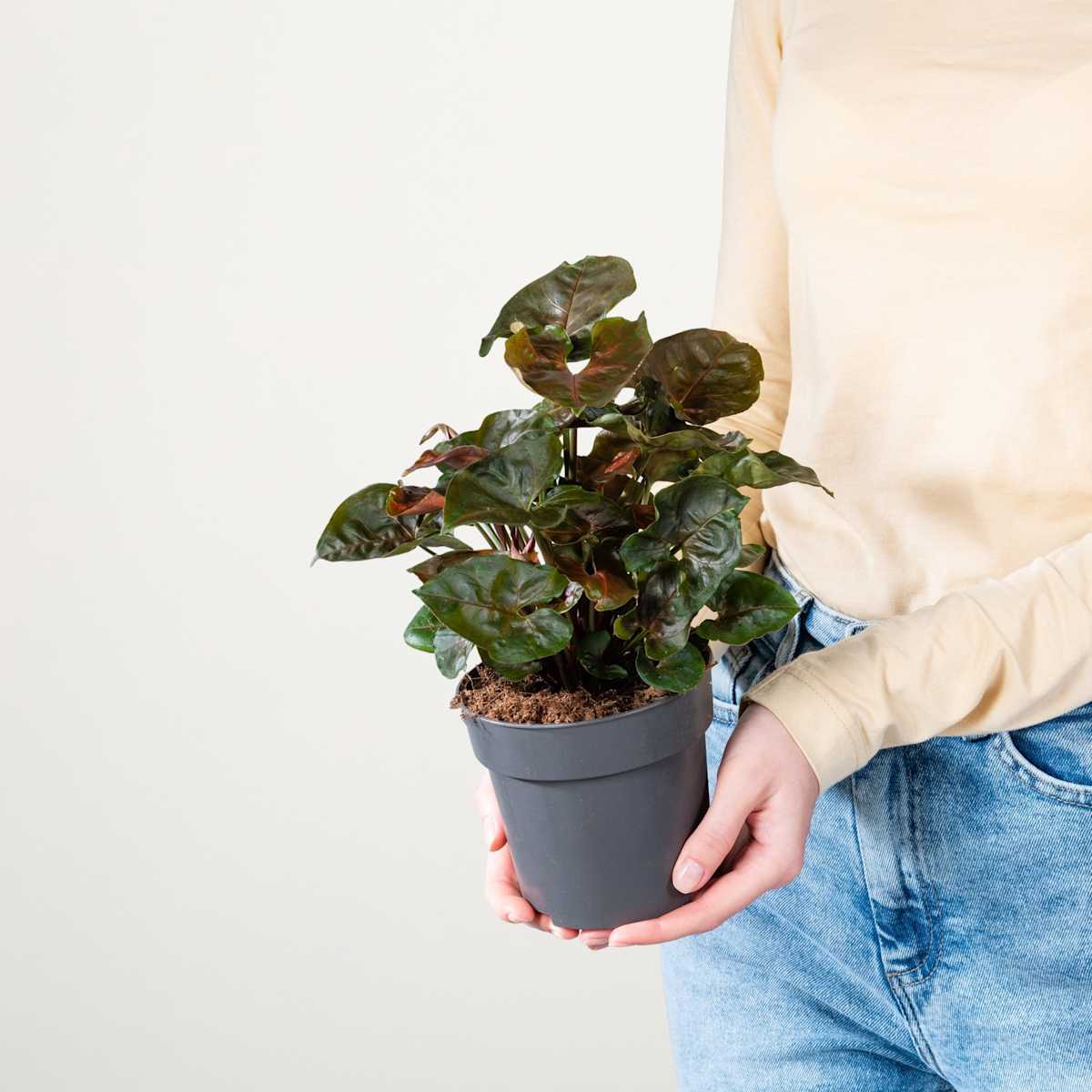 Purpurtuten gibt es in so vielen verschiedenen Farben und wenn du denkst du kennst sie alle, kommt noch eine andere dazu. Wie die Syngonium ‚Maria Brocante‘. Ihre Blattfarbe lässt sich ungefähr mit ein glänzendes ‚Bronze-grün-rot-bronze (sorry, hatten wir schon)-rosa-bräunlich‘ bezeichnen. Aber am besten machst du dir selbst ein Bild! Vielleicht ist sie bei dir ja auch ‚dunkelgrün-bräunlich-rot-bronze-rosa‘. Was du sonst noch wissen musst? Die Purpurtute ‚Maria Brocante‘ muss regelmäßig gegossen werden. Wenn du darauf achtest, dass die Erde immer leicht feucht ist, belohnt sie dich mit kräftigem Wuchs. Immerhin bis zu 40 cm hoch und breit kann sie werden. Am besten kann sie das an einem sonnigen bis halbschattigen Standort.
