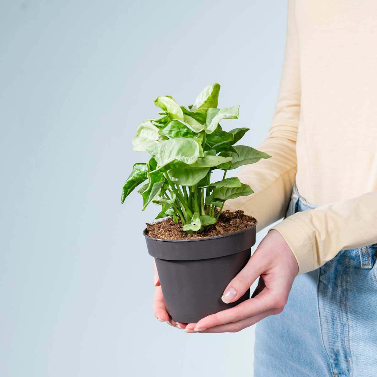 Ups! Wollte sich die Purpurtute ‚Milk Confetti‘ da etwa gerade einen Erdbeer-Milchshake machen und hat den Deckel auf dem Mixer vergessen? Ok, war nur Spaß. Die Blätter der Syngonium podophyllum, wie sie sich botanisch nennt, sehen von Natur aus so grünweiß mit rosa Flecken aus. Die Purpurtute ist eine rankende Pflanze, die bis zu 40 cm hoch und breit werden kann. Sie ist übrigens mit fast jedem Standort fein – solange du nicht den Deckel auf dem Mixer vergisst. Zugegeben, die Purpurtute ‚Milk Confetti‘ mag keine Erdbeer-Milchshakes. Aber regelmäßig Wasser ist toll. Wenn du darauf achtest, dass die Erde immer leicht feucht ist, belohnt sie dich mit kräftigem Wuchs. Am besten kann sie das an einem sonnigen bis halbschattigen Standort.