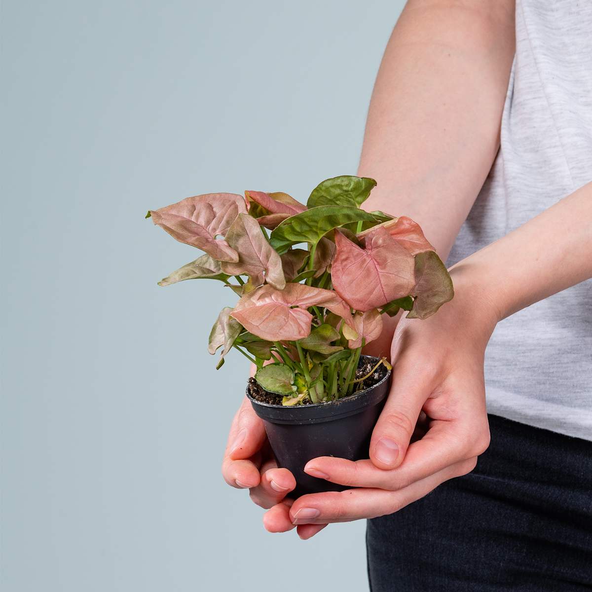 Oben rosa, darunter Grün und ganz unten durchsichtig. Tja, dieses Pfeilblattgewächs weiß schon, wie es die Blicke auf sich zieht. Dabei wäre der Name Syngonium ‚Neon‘ schon aufregend genug. So präsentiert diese raffinierte Grünpflanze aber nicht nur ihre rosa-grünen Herzblätter, sondern auch noch ihre reizenden Wurzeln in einer stylischen Glasvase. Die Syngonium wird etwa 60 cm hoch und 40 cm breit. Und damit sie auch im Dunkeln gesehen wird, kannst du sie auch noch beleuchten mit der im Sockel integrierten LED. Die Syngonium ‚Neon‘ möchte immer frisches Wasser in ihrem Glas haben. Sei nur bitte etwas vorsichtig beim Gießen, du weißt ja: Wasser und Elektrik… Ach ja, und ein sonniger bis halbschattiger Standort wäre auch nicht schlecht.