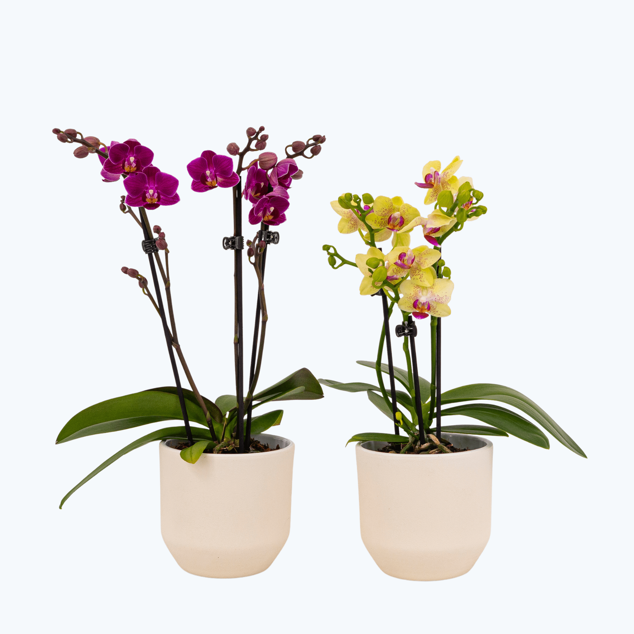 Hier bieten wir dir erstmalig ein 2er-Set Table Dance Orchideen mit mindestens 3 Rispen in hochwertigen weißen Keramiktöpfen an. Wir stellen dir einen Mix aus 2 Table Dance Phalaenopsis in jeweils verschiedenen Farben und Größen zusammen. Beide Pflanzen hatten viel Zeit, in unserer Gärtnerei langsam und gesund aufzuwachsen, sodass du viel Freude an diesen schönen Orchideen haben wirst. Hinweis: Die Farbe und Größe der einzelnen Blüten sowie die Rispenhöhe der Orchideen fallen in der Zusammenstellung unserer Farbmix-Sets stets unterschiedlich aus – die hier gezeigten Orchideen sind nur Beispielfotos. Wenn du spezielle Farbwünsche hast, schreiben uns deinen Farbwunsch gern in das Hinweisfeld in deinem Warenkorb. Im Überblick: 3+ Blütenrispen Topfgröße: 9 cm Größe: ca. 25 – 30 cm Mit hochwertiger Keramik in Weiß