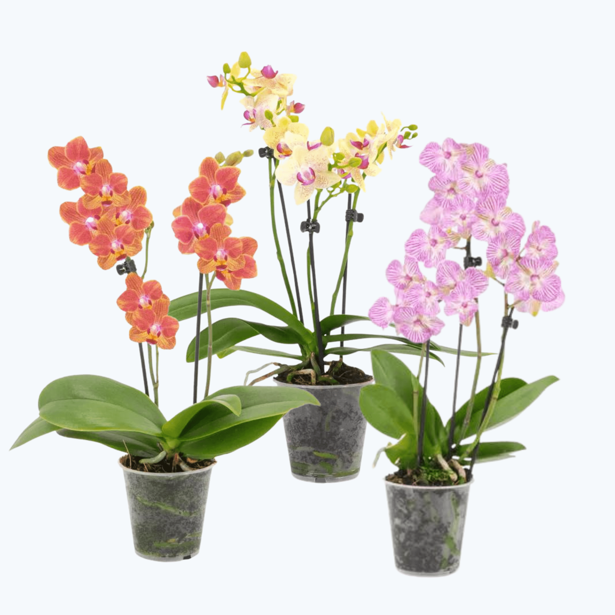Du erhältst ein 3er-Set Table Dance Orchideen mit jeweils mindestens 2 Blütenrispen in verschiedenen Farben, Sorten und Größen. Diese Orchideen eignen sich auch für die Tischdekoration in Restaurants oder in Büroräumen! Hinweis: Die Farbe und Größe der einzelnen Blüten sowie die Rispenhöhe der Orchideen fallen in der Zusammenstellung unserer Farbmix-Sets stets unterschiedlich aus – die hier gezeigten Orchideen sind nur Beispielfotos. Wenn du spezielle Farbwünsche hast, schreiben uns deinen Farbwunsch gern in das Hinweisfeld in deinem Warenkorb. Im Überblick: 2 Blütenrispen Topfgröße: 9 cm Größe: ca. 25 – 30 cm