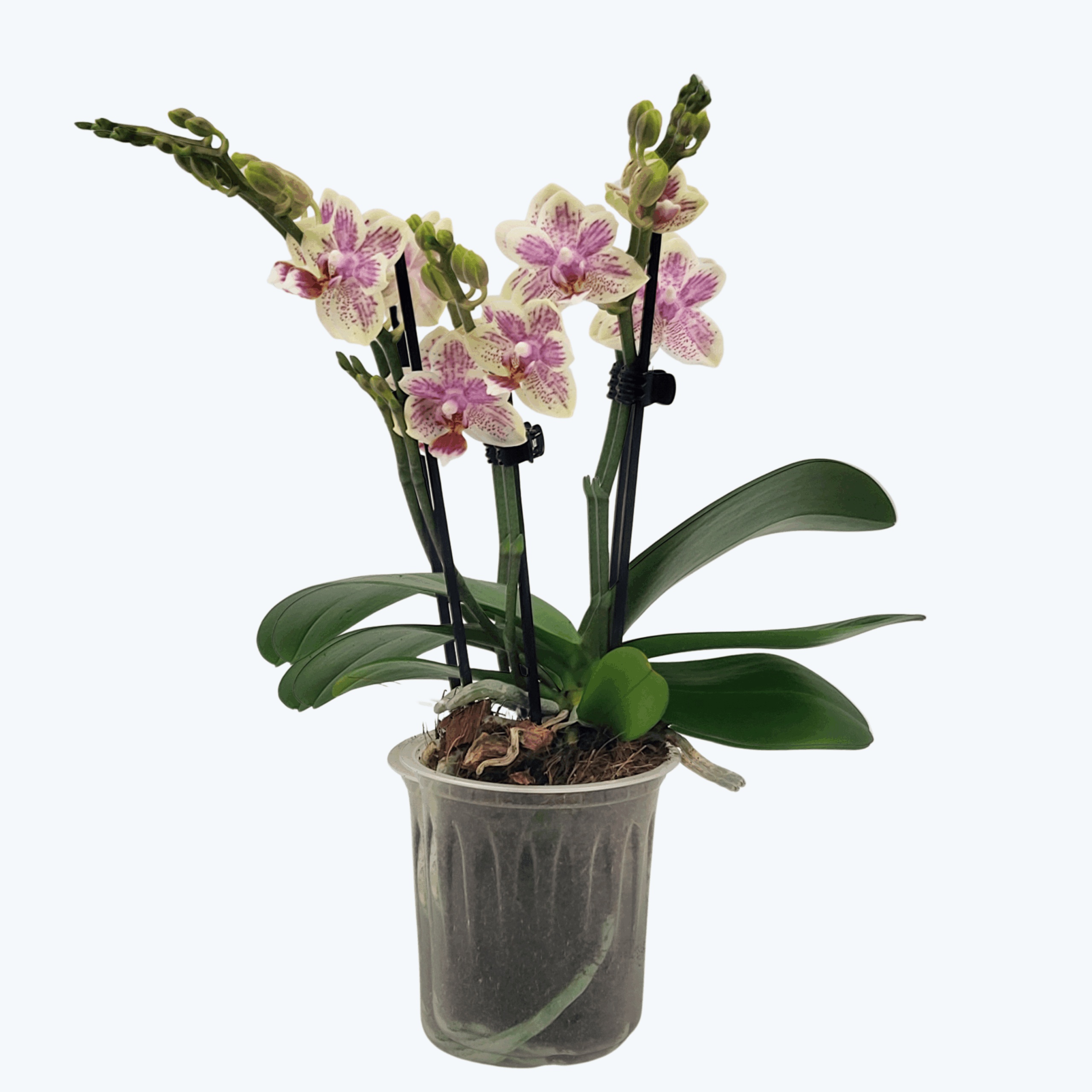 Elegante Table Dance Orchidee Sofia mit zarten cremefarbenen Blüten und auffälligem pink-violetten Muster. Die mehrtriebige Pflanze sorgt für eine besonders üppige und langanhaltende Blüte. Ideal als stilvolle Dekoration für Wohnräume oder als besonderes Geschenk. Pflegeleicht und perfekt für Orchideenliebhaber. Pflegeleicht: Heller Standort ohne direkte Sonne, mäßig gießen und Staunässe vermeiden.