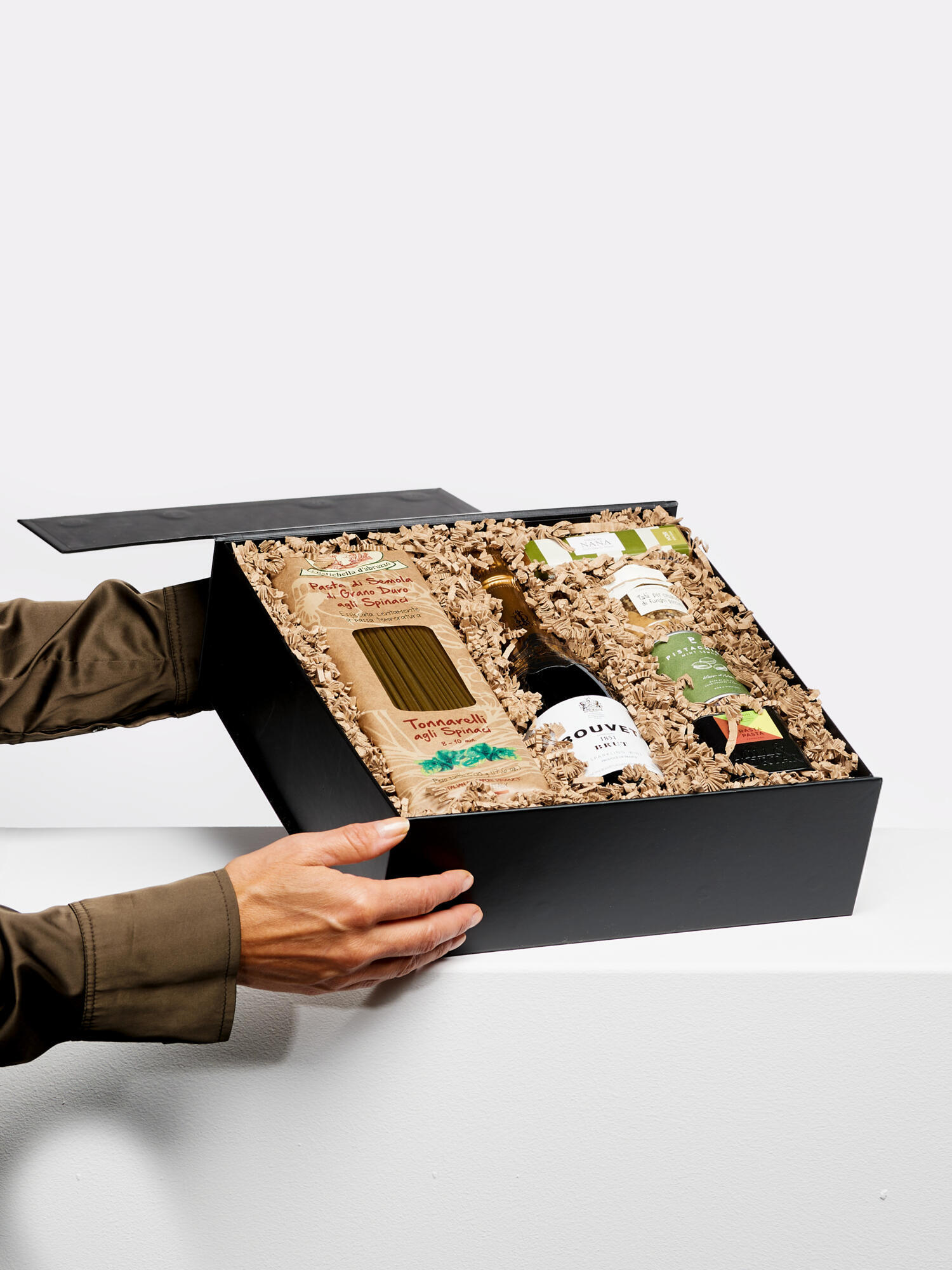 Dieses exklusive Geschenkset vereint klassische Eleganz mit feinem Genuss. Im Mittelpunkt steht ein ausdrucksstarkes Arrangement aus tiefroten Rosen, das für Liebe, Wertschätzung und besondere Momente steht. Die kräftige Farbe und die edlen Blüten machen den Strauß zu einem zeitlosen Highlight. Ergänzt wird das Blumenarrangement durch eine sorgfältig zusammengestellte Genussbox mit ausgewählten Spezialitäten: Bouvet 1851 Blanc, 375ml Pesto di rucola, 80g Tonnarelli agli Spinaci, 500g Mint Lemon, 50g Premium Espresso, 250g Lait Nougat Or, 45g Ob zum Jubiläum, Valentinstag oder als stilvoller Gruß mit besonderem Anspruch – dieses Geschenkset verbindet florale Schönheit mit kulinarischer Vielfalt und bleibt garantiert in Erinnerung.