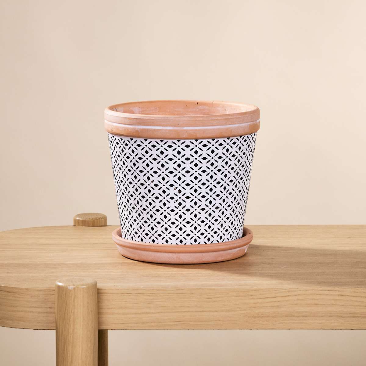 Du möchtest beste Voraussetzungen für ein gesundes Pflanzenwachstum schaffen? Dann entscheide dich für unseren „Terrakotta Übertopf Schwarz – 14 cm“. Er hat eine Außenhöhe von 14 cm und verfügt über ein praktisches Abflussloch. Der Außendurchmesser beträgt 15,5 cm, der Innendurchmesser 14 cm. Jeweils gemessen im oberen Bereich. Damit deine Möbel vor Wasserflecken geschützt sind, wird der Terrakotta-Übertopf inklusive passendem Untersetzer geliefert. Dieser ist zudem mit drei schwarzen Moosgummifüßchen ausgestattet. Das hübsche Muster auf dem Topf zieht die Blicke magisch an. Terrakottatöpfe bieten übrigens den Vorteil, dass sie atmungsaktiv und offenporig sind. Hier können die Pflanzenwurzeln atmen und überschüssiges Gießwasser wird nach außen abgegeben. Deine Pflanzen lieben das!