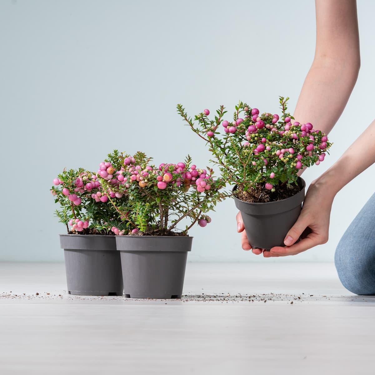 Botanisch hört sie auf den Namen Pernettya mucronata, klingt irgendwie niedlich, oder? Und tatsächlich ist die Rosa Torfmyrthe eine wirklich süße Pflanze. Schon allein ihre Wuchshöhe von ‚nur‘ 35 cm, bei einer Breite von etwa 30 cm, macht aus diesem Gehölz einen putzigen Bewohner für kleine Beete, Blumenkübel oder Balkonkästen. Von Mai bis Juni trägt sie hübsche, weiße Blüten über ihrem dunkelgrünen Blätterkleid, das sie übrigens das ganze Jahr über trägt. Ab September schmückt sie sich dann mit kleinen, rosafarbenen Beeren. Das sieht süß aus – ist aber nichts zum Naschen! Immer genügend Wasser, dazu ein windgeschützter, sonniger bis halbschattiger Standort, mehr braucht die Rosa Torfmyrthe nicht um munter zu wachsen.