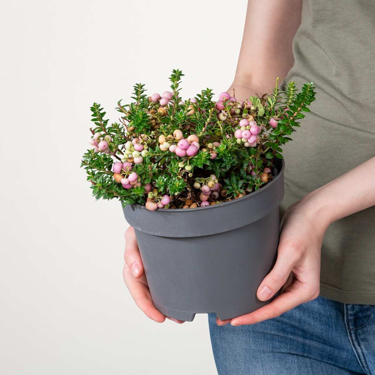Botanisch hört sie auf den Namen Pernettya mucronata, klingt irgendwie niedlich, oder? Und tatsächlich ist die Rosa Torfmyrthe eine wirklich süße Pflanze. Schon allein ihre Wuchshöhe von ‚nur‘ 35 cm, bei einer Breite von etwa 30 cm, macht aus diesem Gehölz einen putzigen Bewohner für kleine Beete, Blumenkübel oder Balkonkästen. Von Mai bis Juni trägt sie hübsche, weiße Blüten über ihrem dunkelgrünen Blätterkleid, das sie übrigens das ganze Jahr über trägt. Ab September schmückt sie sich dann mit kleinen, rosafarbenen Beeren. Das sieht süß aus – ist aber nichts zum Naschen! Immer genügend Wasser, dazu ein windgeschützter, sonniger bis halbschattiger Standort, mehr braucht die Rosa Torfmyrthe nicht um munter zu wachsen.