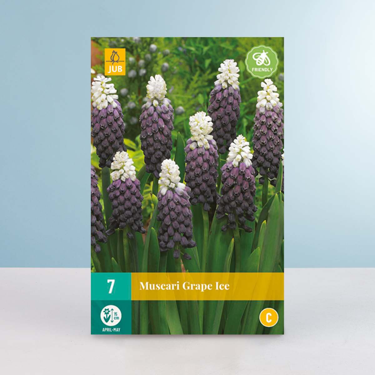 Denkst du bei Traubenhyazinthen auch gleich an diese wunderschönen Blütenrispen, die aussehen, als wären sie aus blauen Perlen gemacht? Tja, das geht auch anders und deshalb solltest du dir die Traubenhyazinthe ‚Grape Ice‘ nicht entgehen lassen. Am besten pflanzt du die sieben Zwiebeln, die du von dieser Vertreterin der Art Muscari latifolium erhältst, in durch lässige Erde an einem sonnigen bis halbschattigen Standort. Das kann übrigens auch ein Kübel auf Balkon oder Terrasse sein. Zwischen April und Mai ist es dann soweit: Die Blütenstände strecken sich empor und sind – Wow! – dunkelviolett mit einer weißen Haube! Ein echter Blickfang, auch wenn die Traubenhyazinthe ‚Grape Ice‘ nur etwa 25 cm hoch wird.