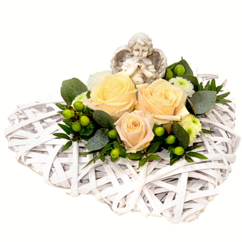 Schöner Trauergruß in Herzform (ca. 25 cm) aus weißem Wurzelholz dekoriert mit cremefarbenen Rosen grünen Hypericum weißen Santiniballs Pistochia Eukalyptus und betendem Engel aus Polyresin. Hinweis: Dieser Artikel kann mit dem Zustelldienst nicht direkt an einen Friedhof geliefert werden. Bitte wähle als Empfänger-Adresse das Trauerhaus oder Bestattungsunternehmen.