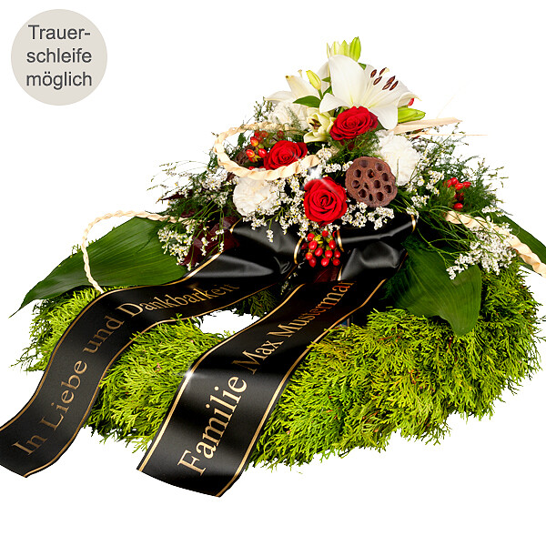 Einzigartiger Trauergruß mit roten Rosen roten Hypericum weißen Lilien weißen Nelken weißen Limonium Lotus Palm Snake rotem Eichenlaub Aspidistra Asparagus plumosus und Salal in einem grünen Kranz. Durchmesser ca. 60 cm. Hinweis: Die Lilien des Kranzes kommen im frischen und unaufgeblühten Zustand. Sie öffnen sich später als die anderen Blumen je nach Standort und Temperatur. Die abgebildete Trauerschleife ist nicht im Lieferumfang enthalten. Du kannst diese unten dazu bestellen. Dieser Artikel kann mit dem Zustelldienst nicht direkt an einen Friedhof geliefert werden. Bitte wähle als Empfänger-Adresse das Trauerhaus oder Bestattungsunternehmen. Hersteller:FloraPrima GmbHDidderser Str. 2838176 Wendeburginfo@floraprima.de
