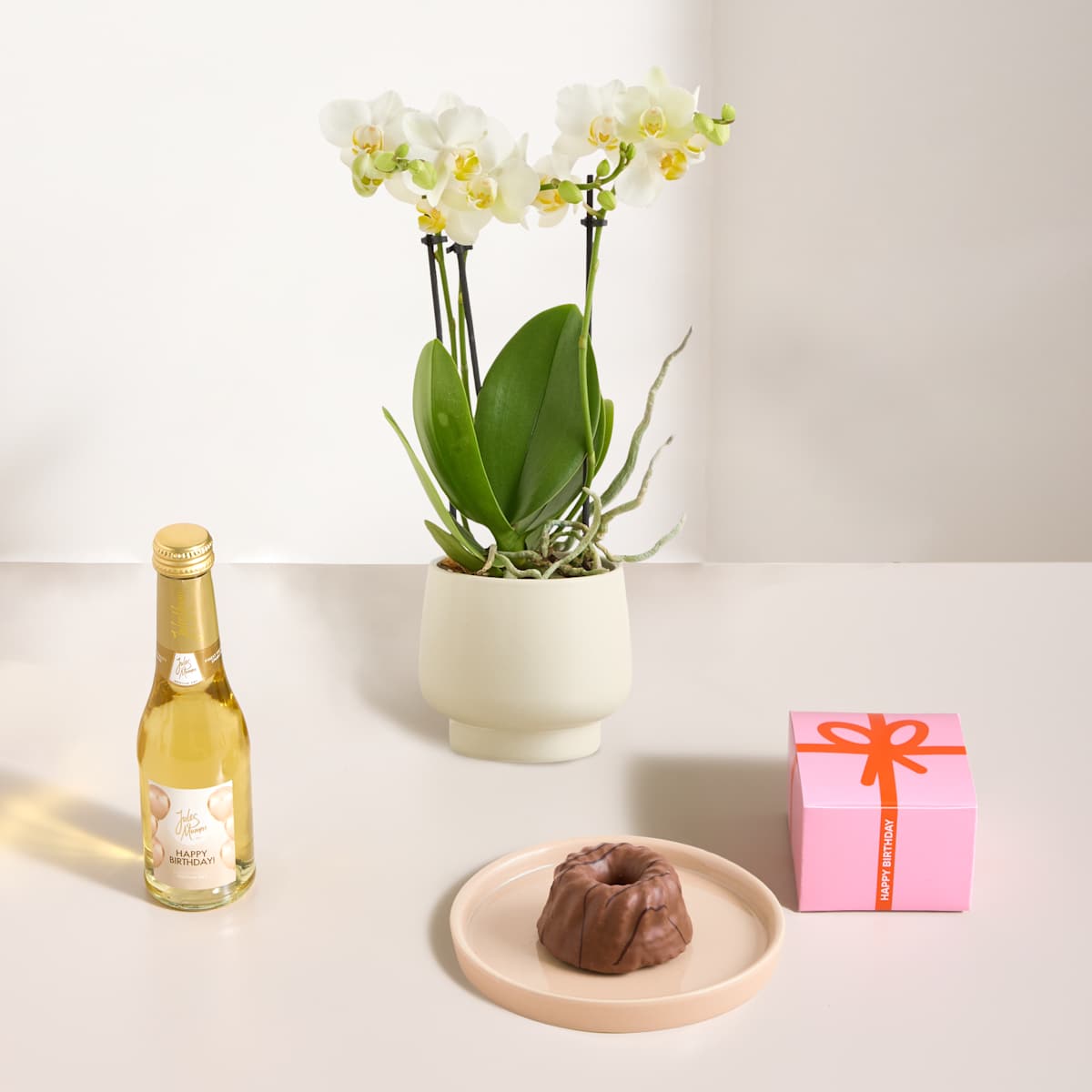 Kaum eine Pflanze verbreitet mehr Eleganz als die Orchidee mit ihrem sattgrünen Blattwerk und ihrer beeindruckenden Blütenpracht, die über viele Wochen und Monate erhalten bleibt. Unsere atemberaubende Orchidee ist eine Schmetterlingsorchidee (Phalaenopsis) mit einer Wuchshöhe von ca. 30 cm. Sie verfügt über drei Rispen, von denen jede mit edlen weißen Blüten bestückt ist. Zudem erreicht sie den Empfänger in einem weißen Keramik-Übertopf. Die Pflanze bevorzugt einen hellen Standort ohne direkte Sonneneinstrahlung und freut sich über wöchentliche Tauchbäder. Fühlt sich die Orchidee wohl, bringt sie immer wieder neue Blüten hervor. Von diesem bezaubernden Anblick ist jeder Pflanzenfreund begeistert.