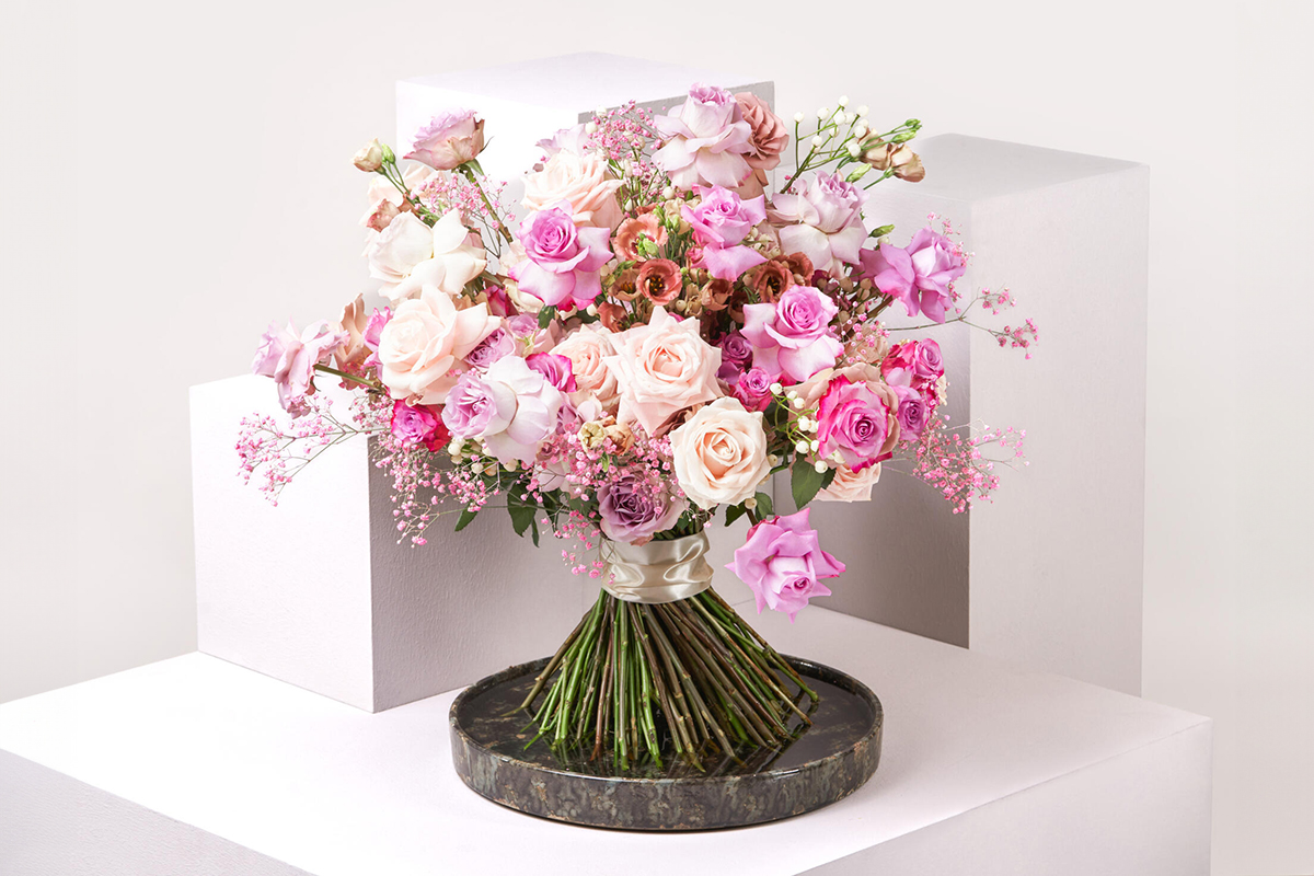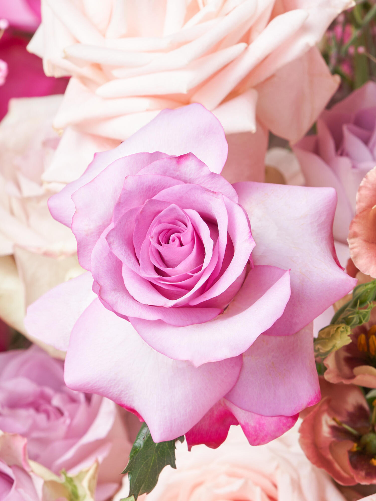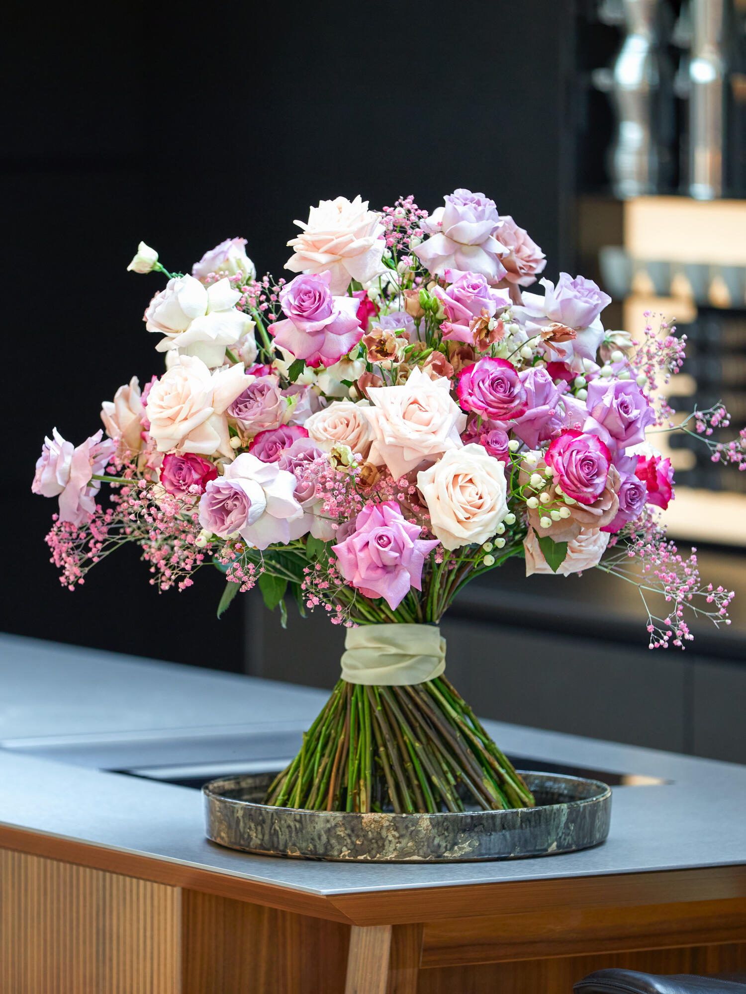 Erleben Sie ein stilvolles Rosenarrangement mit dem exklusiven Blumenstrauß „Très Chic“! Dieser rund gebundene, aber mit Höhen und Tiefen aufgelockerte Rosenstrauß ist ein wahres Meisterwerk der floristischen Handwerkskunst. Jeder Strauß wird sorgfältig aus verschiedenfarbigen, großblütigen Rosen in Blassviolett, Apricot, Rosa und Creme-Tönen zusammengestellt, um eine harmonische Farbpalette zu schaffen, die alle Sinne berührt. Um dem Strauß zusätzlich eine besondere Note zu verleihen, werden einige Rosen glamourös aufgefaltet, um ihre volle Schönheit zur Geltung zu bringen. Zwischen den Rosen finden Sie zarte lachsfarbene Lysianthus-Blüten, luftiges Schleierkraut und dezentes Hypericum in Weiß, die den Strauß perfekt in Szene setzen. Bei diesem außergewöhnlichen Blumenarrangement verzichten wir bewusst auf grünes Beiwerk, um die sinnliche Schönheit der Rosen in den Vordergrund zu stellen. Ein absolutes Highlight ist die elegante Bindestelle, die mit einem cremefarbenen Satinband verziert wird und so dem Strauß eine luxuriöse Note verleiht. Mit seiner beeindruckenden Gesamtlänge von 65 cm und einem Durchmesser von 80 cm ist dieser Rosenstrauß ein betörender Blickfang, der jeden Raum in duftig zartem Rosé erstrahlen lässt. Gönnen Sie sich oder Ihren Liebsten dieses extravagante Blütenerlebnis und lassen Sie sich von der strahlenden Eleganz der großblütigen Rosen verzaubern.