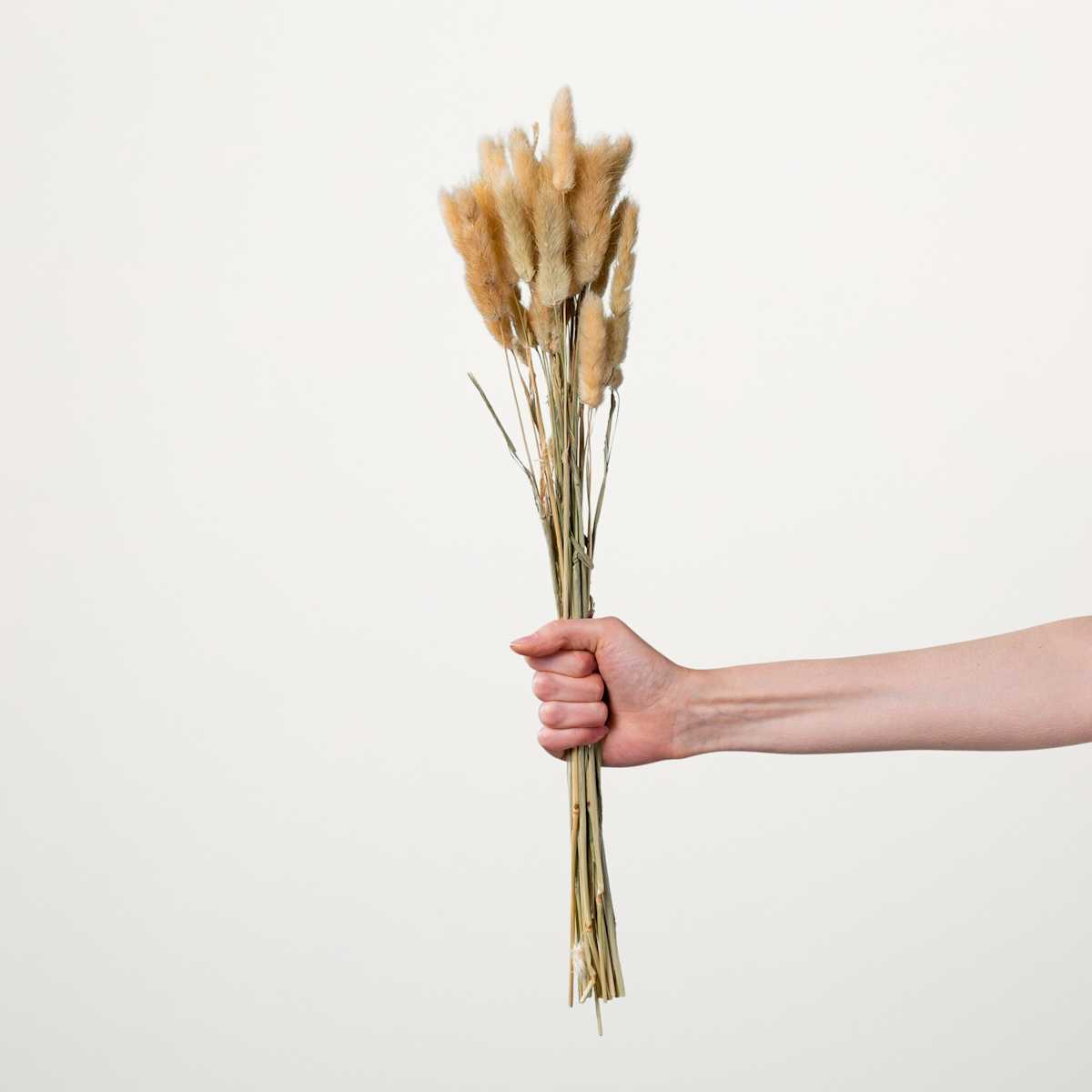 Puschel hier und Puschel da. Nicht nur mit deinem Lieblingskaninchen wird ordentlich gepuschelt. Auch in deiner Vase ist das 45–50 g leichte Puschelfieber ausgebrochen. Der naturfarbene Bund Lagurus kuschelt samtig weich vor deinen neugierigen Händen, die immer wieder von den 60 cm langen Trockenblumen angezogen werden. Du sehnst dich nämlich danach, echte Natur auch im Kontakt mit der Pflanzenwelt zu spüren und deine Gräserchen am liebsten nicht mehr loszulassen. Wenn du in Hasenschwänzchen-Art deine Lagurus vorsichtig streichelst, werdet ihr lange Zeit euch gegenseitig bepuscheln dürfen.