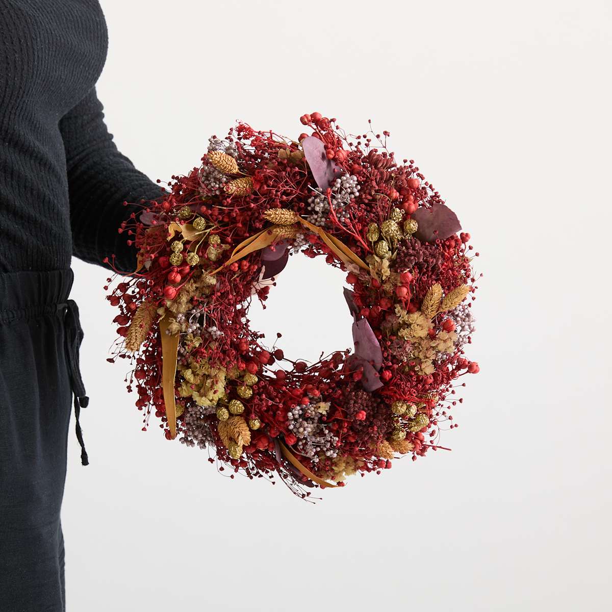 Der Trockenblumenkranz in Apricot und Goldfarben ist ein echter Hingucker und bringt frischen Wind in jede Wohnung. Mit einem Durchmesser von 25 bis 30 cm vereint dieser Kranz angsagtes Design und festliche Stimmung. Die warmen roten Töne der Trockenblumen harmonieren perfekt mit den goldenen Beeren und schaffen eine einladende Atmosphäre. Ob an der Tür, über dem Kamin oder als dekorativer Akzent an der Wand – dieser Kranz sorgt überall für Freude und setzt stilvolle Akzente. Durch die langlebigen Materialien ist er nicht nur eine dekorative Ergänzung, sondern auch eine praktische Wahl, die das Zuhause das ganze Jahr über schmückt. Möchte man einem Raum eine besondere Note verleihen? Der Trockenblumenkranz ist ideal, um Gemütlichkeit und Stil zu kombinieren. Mit seinem eleganten Look und den warmen Farben wird er schnell zum neuen Lieblingsstück und sorgt für gute Laune in jedem Raum.
