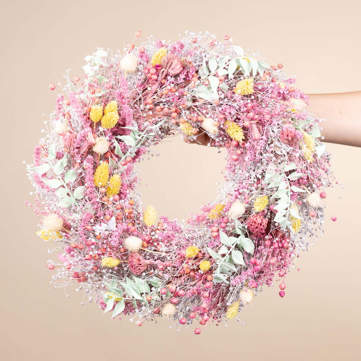 Du liebst natürliche Blumen und möchtest dich immer an ihrem Anblick erfreuen können? Dann solltest du dir unseren Trockenblumenkranz Blooming Flower nicht entgehen lassen. Er ist absolut pflegeleicht und bleibt zudem ewig schön. Mit einem Durchmesser von etwa 30 cm ist er eine zauberhafte Zierde für deinen Tisch, die Wandfläche oder auch die Tür. Neben getrocknetem Schleierkraut mit kleinen weißen Blüten enthält der Kranz Trockenblumen in zartem Rosa. Beachte bitte, dass die Farben der Blumen durch Sonneneinstrahlung etwas blasser werden. Wusstest du übrigens, dass Kränze ein Symbol für Hoffnung und Unendlichkeit sind? Also mal ehrlich, uns hat der schöne Trockenblumenkranz absolut überzeugt!
