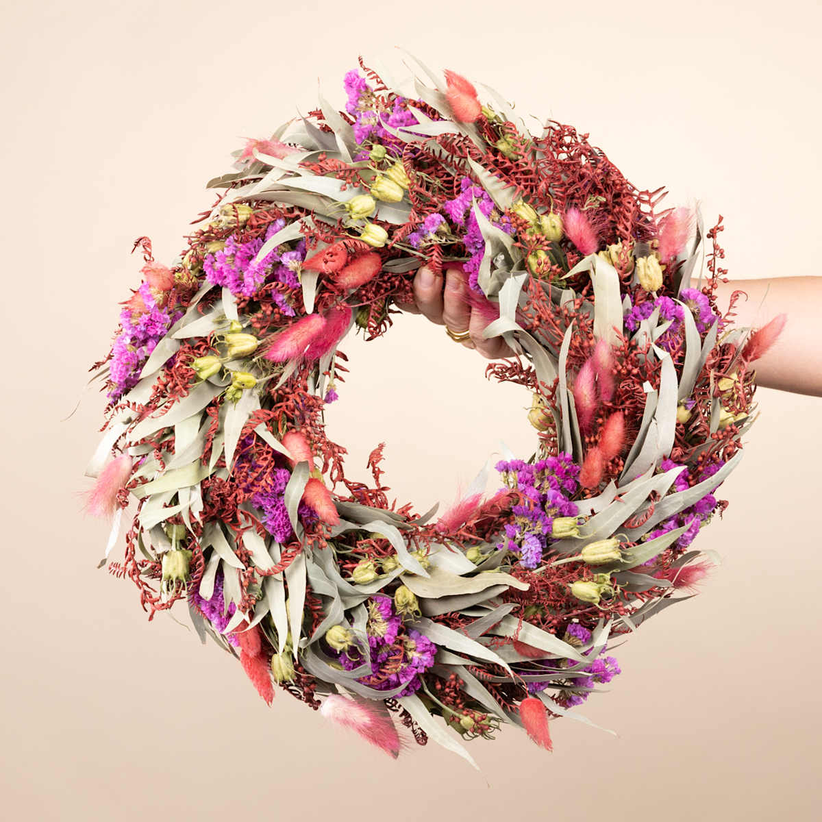 Der Trockenblumenkranz Eukalyptus Lover macht seinem Namen alle Ehre, denn er enthält gleich zwei Sorten Eukalyptus. Statice, Nigella und kleine Beeren sind zusammen mit Lagurus und Farn seine Begleiter. Dieser farbenfrohe Kranz hält ewig. Er eignet sich perfekt zur Dekoration an der Tür, auf dem Tisch oder an der Wand, da er einseitig gebunden ist. Wenn er bei dir zu Hause eintrifft, brauchst du nur noch ein passendes Plätzchen für ihn – am besten ohne direkte Sonne, damit er nicht ausbleicht. Pflege ist nicht nötig. Mit einem stattlichen Durchmesser von 30 bis 35 cm fungiert er als Blickfänger. Beachte, dass dieses Naturprodukt leicht variieren kann, was Form, Farbe und Größe angeht.