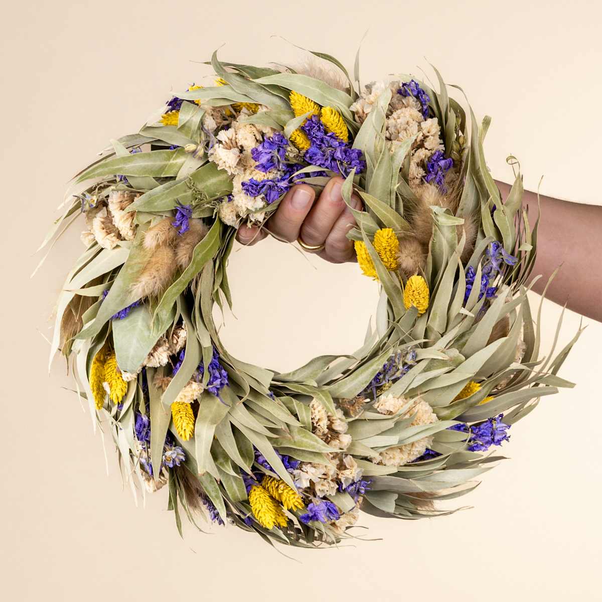 Die Natur malt die schönsten Bilder. Mit unserem meisterhaften Trockenblumenkranz Hello Sunshine fängst du diese Schönheit dauerhaft ein. Du kannst den Kranz als Türschmuck, Wandschmuck oder auch als Tischdekoration verwenden. Zusammengesetzt ist er aus herrlichem Eukalyptus, flauschigem Lagurus, Phalaris und Statice in Mint, Gelb, Blau und Natur. Der Durchmesser dieser Dekoration liegt bei ca. 25 cm. Da es sich bei dem Trockenblumenkranz um ein Naturprodukt handelt, können Form, Farbe und Größe leicht variieren. Die Trockenblumen benötigen keinerlei Pflege und bleiben ewig schön. Allerdings können sie bei direkter Sonneneinstrahlung gegebenenfalls etwas ausbleichen. Das hübsche Deko-Highlight eignet sich auch sehr gut als Geschenk. Zeige deinem Lieblingsmenschen die Schönheit der getrockneten Pflanzen.