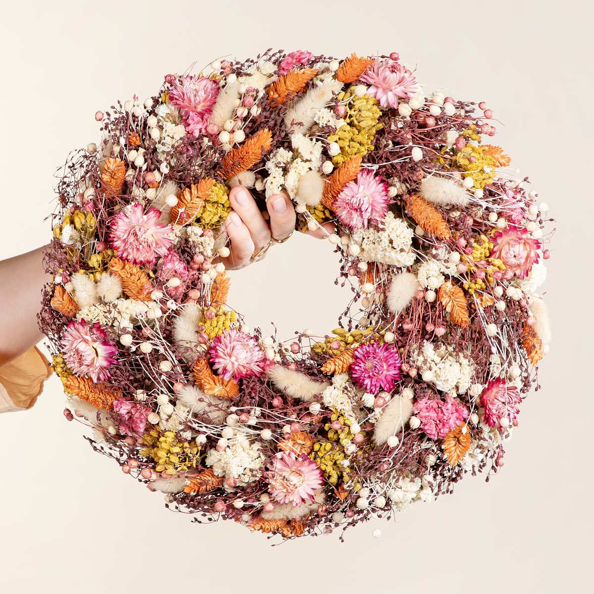 Schmücke deine Türen, die Wandfläche oder deinen Tisch mit einem Blumenkranz, der niemals verblüht. Unser Trockenkranz Munterer Mix bleibt ewig schön und benötigt keinerlei Pflege. Er ist einseitig gebunden und erreicht einen Durchmesser von ca. 30 cm. Zusammengesetzt ist er aus flauschigem Lagurus, prächtigen Phalaris, Flachs, feiner Statice, Achillea sowie Gräsern und getrockneten Beeren. Liebliche Strohblumen verleihen der schönen Dekoration den letzten Schliff. Da es sich bei dem Kranz um ein Naturprodukt handelt, können Form, Größe und Farbe leicht variieren. Hier spiegelt sich die ganze bunte Pracht der Natur wider. Selbstverständlich kannst du mit dem hübschen Trockenblumenkranz auch deinen Lieblingsmenschen überraschen. Es sind die unerwarteten Geschenke, die das Leben bereichern.