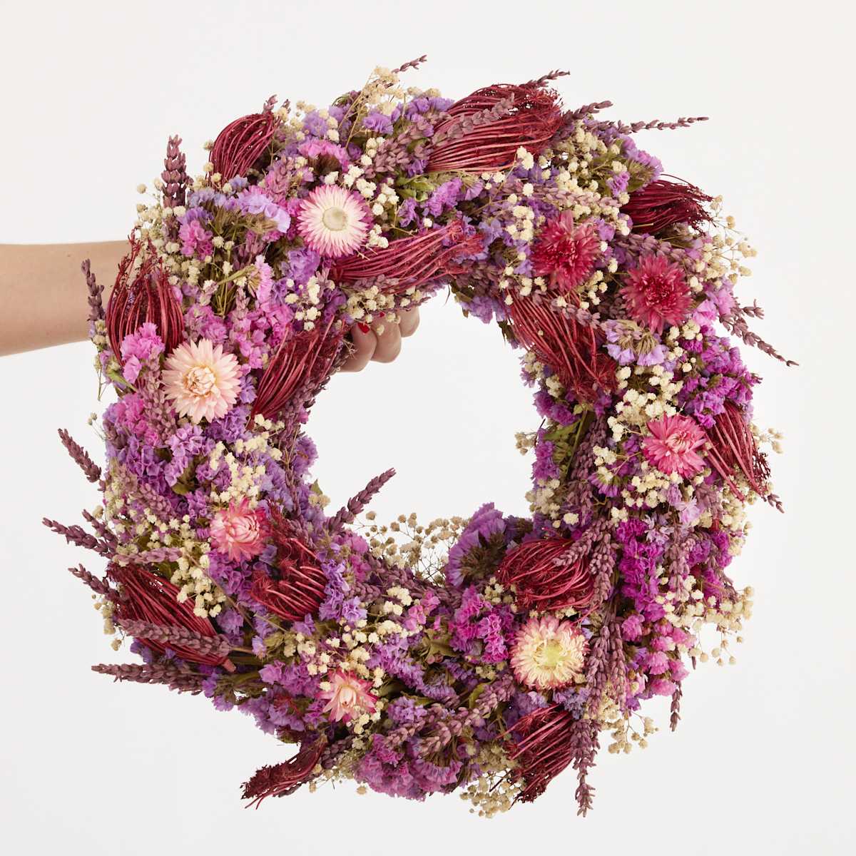 Trockenblumen verströmen einen ganz eigenen Zauber. Sie halten die Schönheit der Natur ewig fest und benötigen keinerlei Pflege. Wäre das nicht auch etwas für dich? Unser Trockenblumenkranz Purple Romance präsentiert sich in angesagten Fliedertönen und erreicht einen Durchmesser von etwa 30 bis 35 cm. Neben Wilder Möhre und Statice enthält er getrockneten Lavendel und filigranes Schleierkraut. Letzteres unterstreicht die romantische Note dieses Kunstwerks. Du kannst den einseitig gebundenen Kranz als Wandschmuck, Türkranz oder auch als geschmackvolle Tischdekoration verwenden. Schütze ihn vor direkter Sonneneinstrahlung, denn diese lässt die Farben gegebenenfalls etwas verblassen. Da es sich um ein Naturprodukt handelt, können Form, Farbe und Größe leicht variieren.