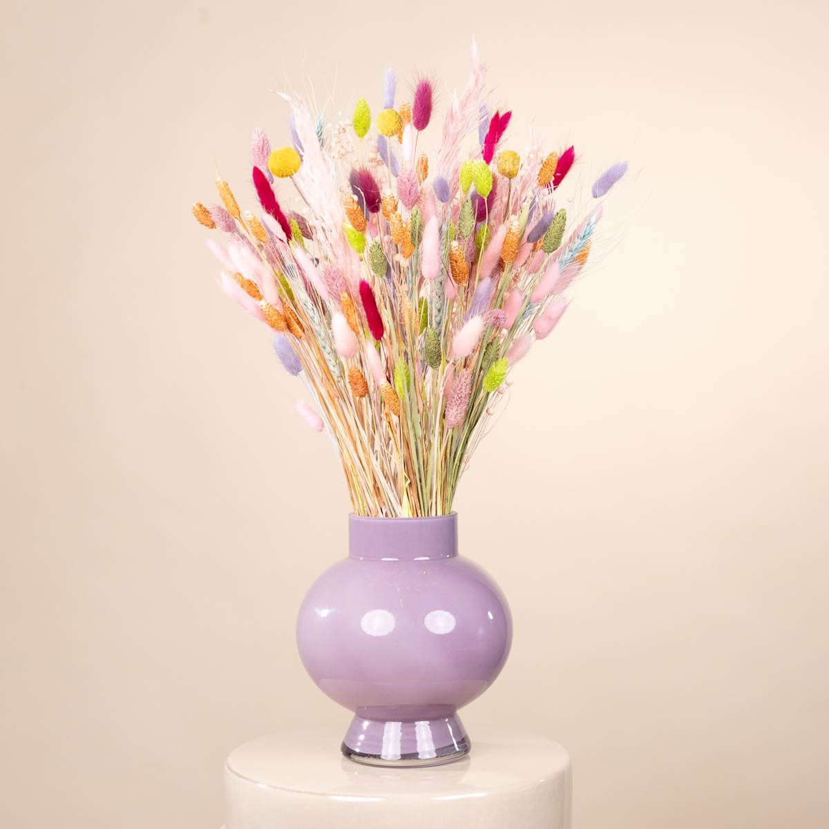 Überrasche deine Liebsten mit dem farbenfrohen Trockenblumenstrauß Color Crush. Mit einer Länge von ca. 50 cm bringt dieser Strauß eine lebendige Farbpalette in jedes Zuhause. Der Strauß kombiniert fliederfarbenen, rosa und pinken Lagurus, orangenen, rosa und grünen Phalaris, rosa Pampasgras, rosa Flachs und natürlich-gelbes Craspedia zu einem harmonischen und fröhlichen Arrangement. Die Trockenblumen bleiben ewig schön, auch wenn sie durch Sonneneinstrahlung mit der Zeit etwas an Farbintensität verlieren können. Unser Trockenblumenstrauß kann für jede Vase beliebig gekürzt werden. Schenke diesen zauberhaften Strauß und bringe Farbe und Freude in den Alltag deiner Liebsten!