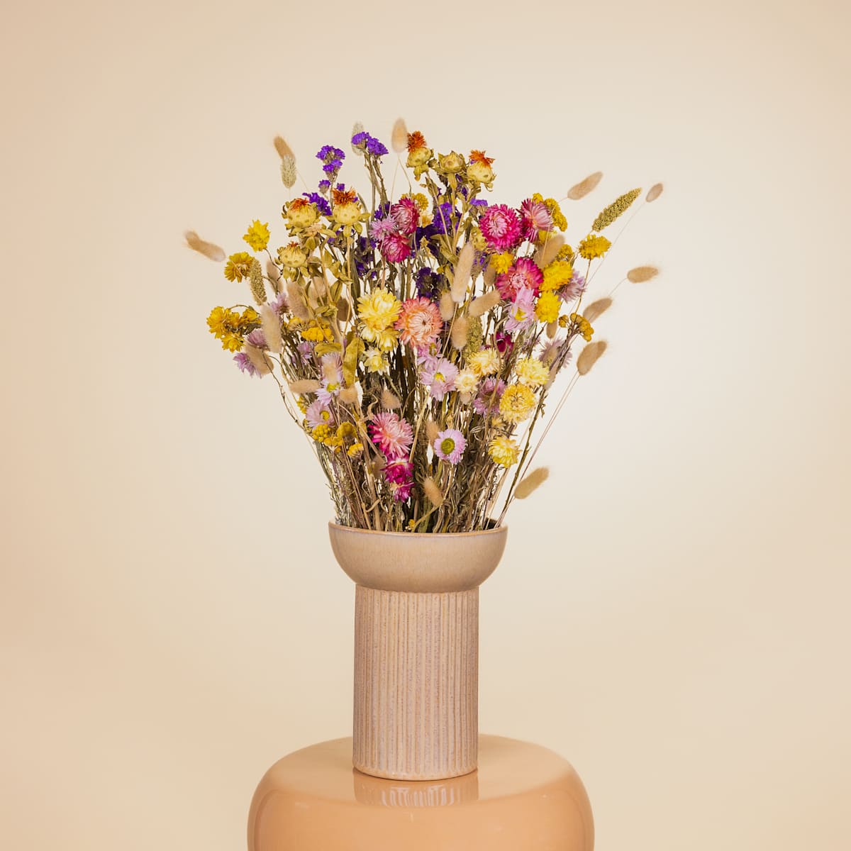 Erfreue dich an einem fröhlich bunten Blumenstrauß, der dauerhaft schön bleibt und zudem keinerlei Pflege benötigt. Unser Trockenblumenstrauß Illuminating Flowers XL setzt sich aus gelber Scharfgabe, gelber Kamille, naturfarbener Setaria sowie Strohblumen in Weiß, Pink, Rosa und Gelb zusammen. Komplettiert wird das Arrangement von rosa Rodanthe, naturfarbenen Phalaris, exklusiven Disteln in Orange und lila Statice. Die Stiele der Trockenblumen haben eine Länge von etwa 55 cm und können nach Bedarf gekürzt werden. Eine passende Vase ist nicht im Lieferumfang enthalten. Da es sich bei dem Trockenblumenstrauß um ein Naturprodukt handelt, können Form, Größe und Farbe leicht variieren. Beachte bitte auch, dass die Blumen bei intensiver Sonneneinstrahlung ein wenig ausbleichen.