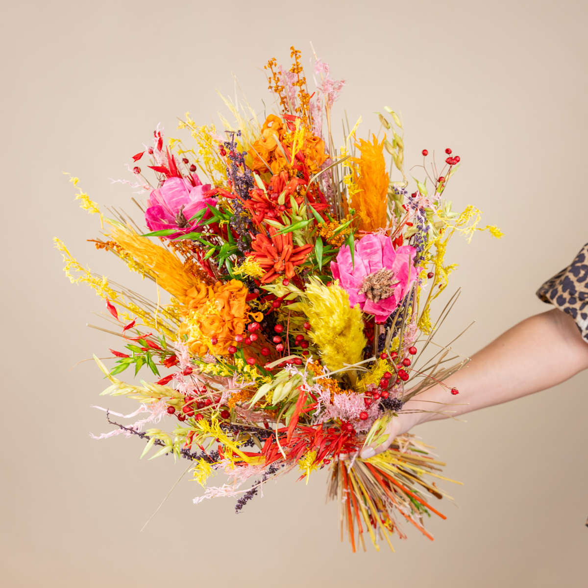 Du liebst warme Farben und kannst dich für Trockenblumen begeistern? Dann ist unser Trockenblumenstrauß Orange Bloom ein absolutes Must-have für dich. Der traumhafte Strauß in sommerlichem Orange, Rosa und Gelb versprüht einen ganz besonderen Charme. Ergänzt wird das natürliche Kunstwerk von üppigen Papierblüten, die geschmackvoll in das Arrangement eingearbeitet sind. Die Stiellänge beträgt etwa 50 cm. Das Besondere an unseren Trockenblumen: Sie benötigen null Pflege und bleiben ewig schön. Du musst also kein Wasser wechseln und verblühen tun sie auch nicht. Na, klingt das nicht gut? Allerdings können die Farben bei intensiver Sonneneinstrahlung ein wenig verblassen, was allerdings nicht weiter schlimm ist. Also am besten gleich zugreifen!