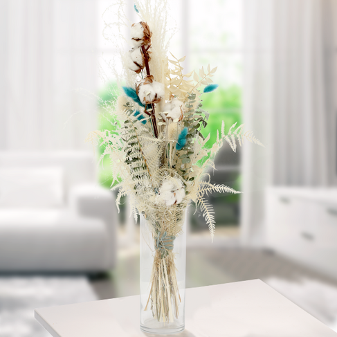 Leichter Trockenstrauß mit 2 weißen Trockengräsern 1 Baumwollzweig 2 Farn 1 Wildgarden Distel 15 Botao Branco 5 petrolfarbenen Lagurus und 4 Eukalyptus.