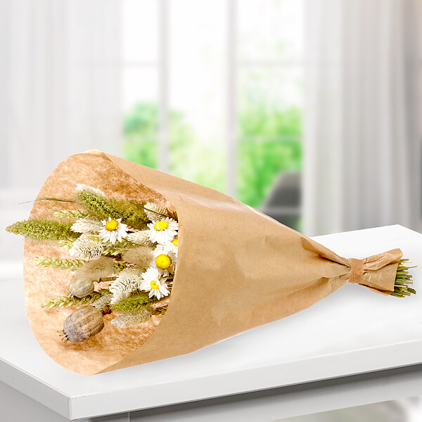 Dieser leichte Trockenstrauß in hellen Tönen ist 35 cm lang und besteht aus Phalaris Papaver Tarwe (Triticum) Setarea Acroclinium und Lagurus Ovatus. Er ist das perfekte Geschenk für jeden Anlass!