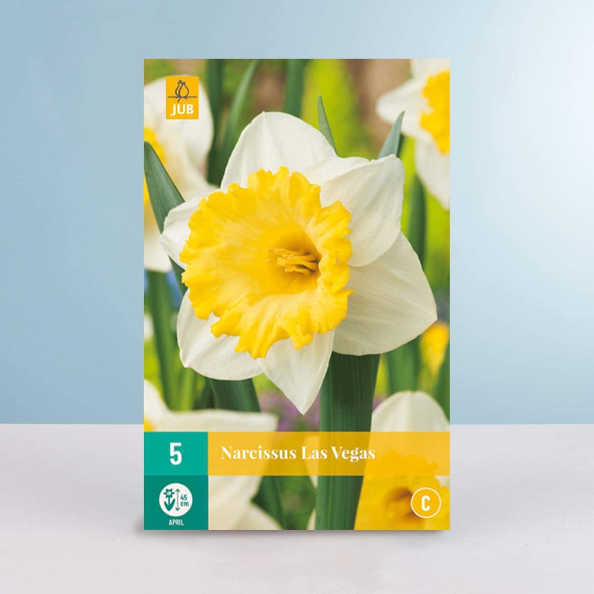 Ab jetzt hält der Frühling mit Pauken und Trompeten bei dir Einzug! Na gut, ganz so viel Radau macht er nicht, aber Trompeten bringt er schon mit. Genauer gesagt die Trompeten-Narzisse ‚Las Vegas‘. Wenn sie im April ihre herrlich weiße Blüte mit der gelben Krone öffnet, ist ihr jede Aufmerksamkeit garantiert. Dabei wird diese Vertreterin der Art Narcissus Hybrid etwa 40 cm hoch. Du kannst die 5 Zwiebeln, die du erhältst, in deinen Garten pflanzen, aber auch in Kübel auf Balkon oder Terrasse. Hauptsache die Erde ist durchlässig und der Standort windgeschützt und sonnig.