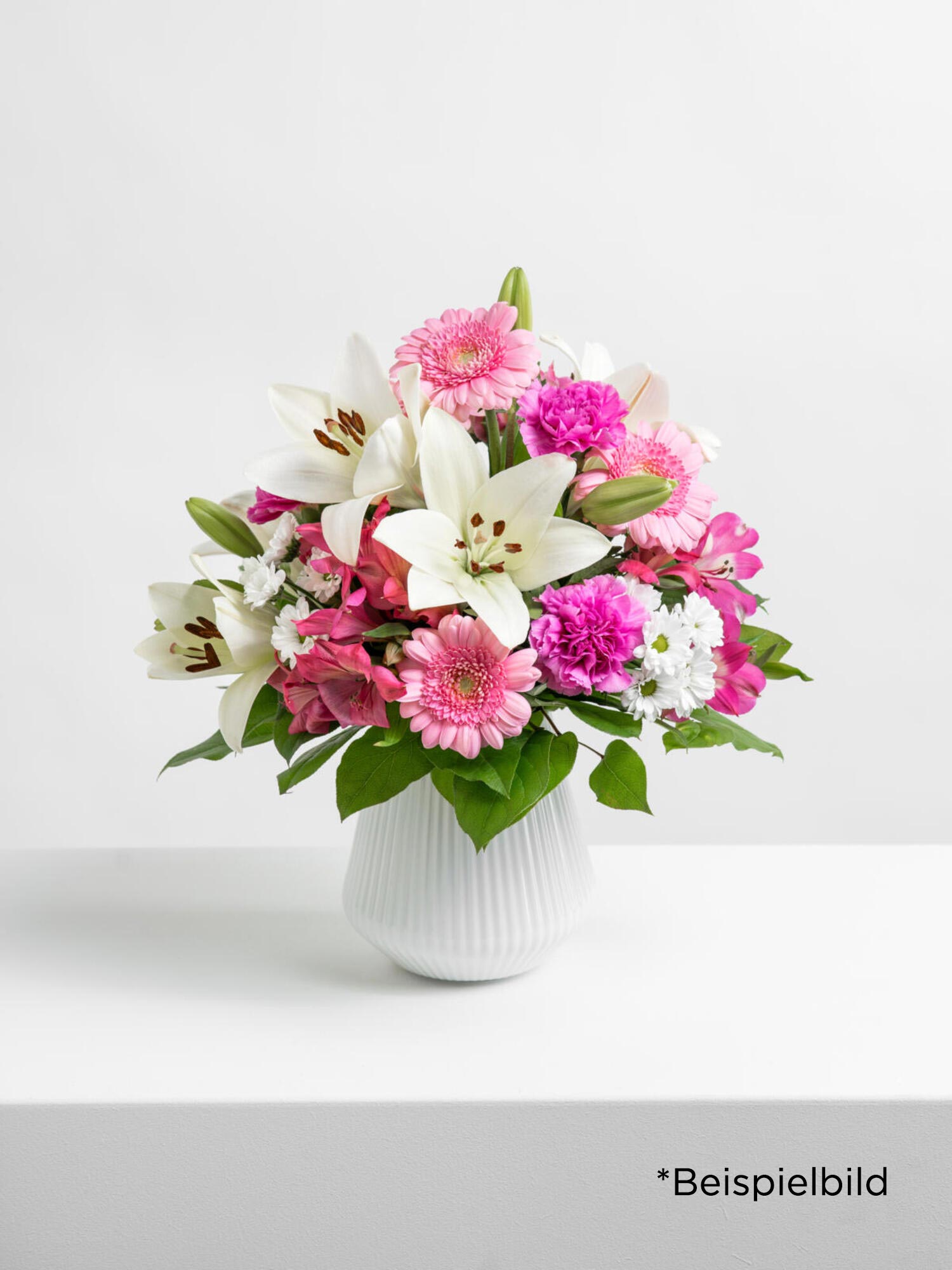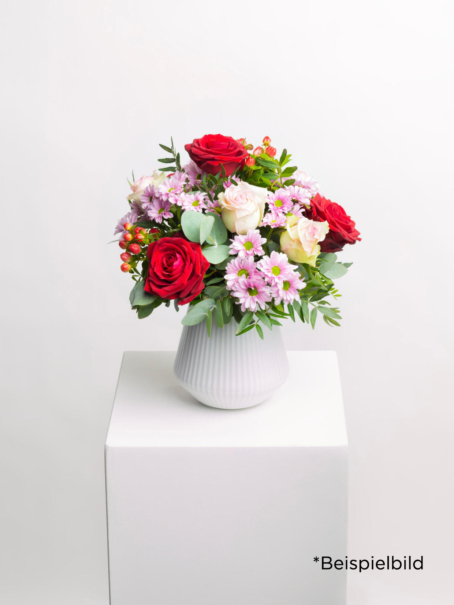 Lassen Sie sich von der Handwerkskunst unserer Floristen überzeugen mit einem Liebes-Überraschungsstrauß aus Blüten der Saison. Jeder Strauß ein Unikat! Strauß zum Thema Liebe in den Farben Rot und Rosa mit weißem Akzent, gebunden mit etwas grünem Beiwerk.