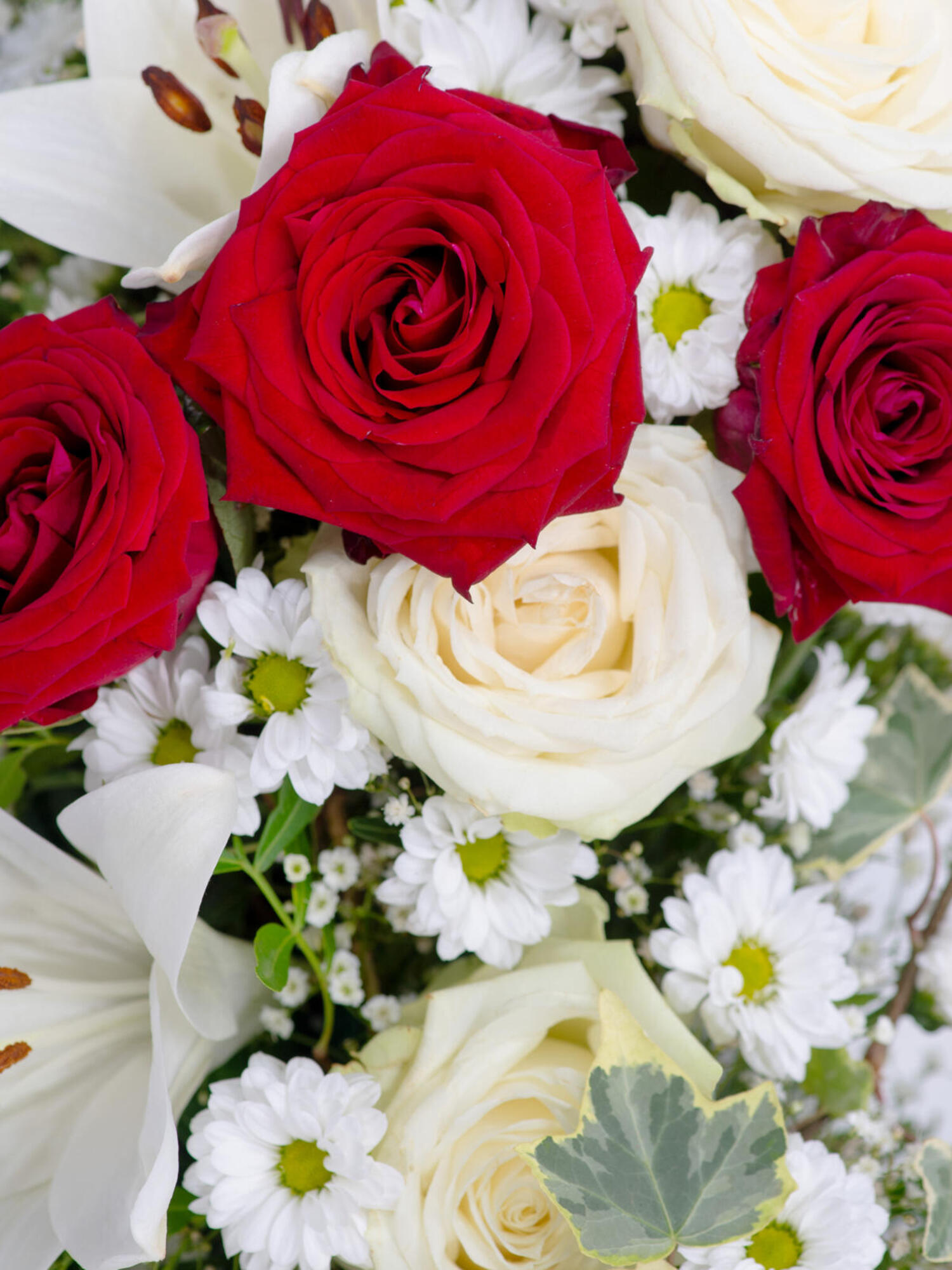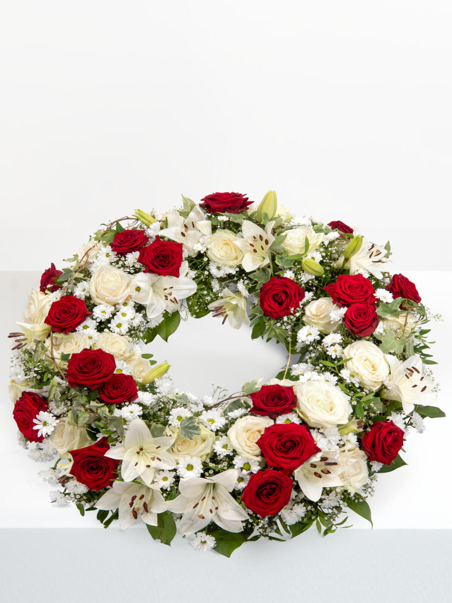 Runder Trauerkranz in Rot-Weiß mit Rosen, Santini, Schleierkraut und Lilien. Als Beiwerk werden Pistazie, Salal und Efeuranken verwendet.