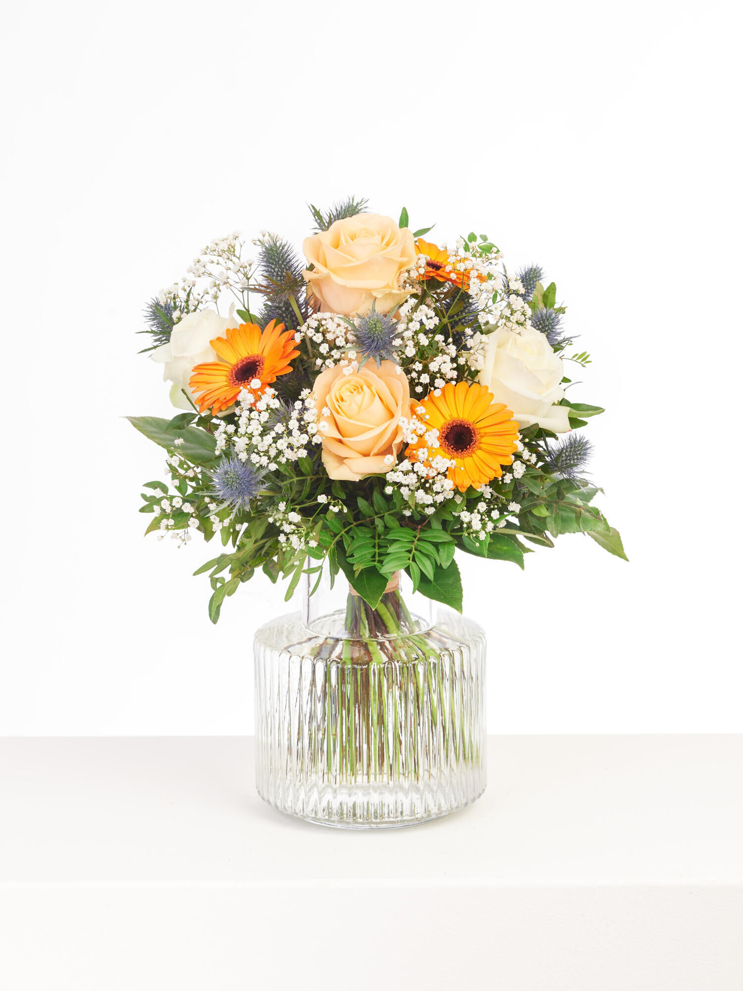Zeigen Sie mit diesem farbenfrohen Blumenstrauß, dass Sie aneinander denken! Rund gebundener Strauß in Apricot-Orange-Weiß-Blau mit Rosen, Germini, Disteln und Schleierkraut. Als Beiwerk werden Pistazie und Aralie verwendet.