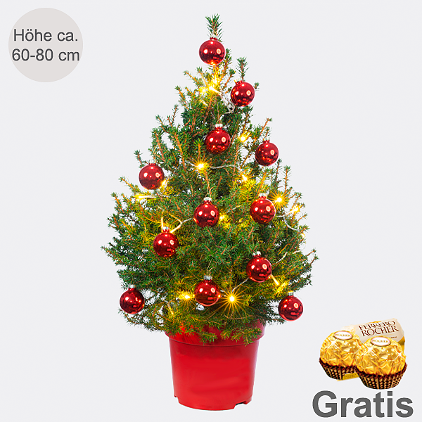 Dein Weihnachtsbaum besteht aus einer Picea Omorika 60-70 cm (inkl. Topf) 1 Lichterkette mit 20 Kerzen und 12 roten Kugeln (ca. 5 cm) inkl. Haken in einem roten Kulturtopf. Der Baum wird im Topf mit Wurzelballen verschickt und kann nach Frostende im Garten eingepflanzt werden.Hinweis: Du erhältst den Baum ungeschmückt. So kommst Du in den Genuss des Baumschmückens mit Deinen Liebsten. Hersteller:FloraPrima GmbHDidderser Str. 2838176 Wendeburginfo@floraprima.de